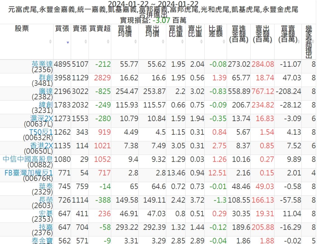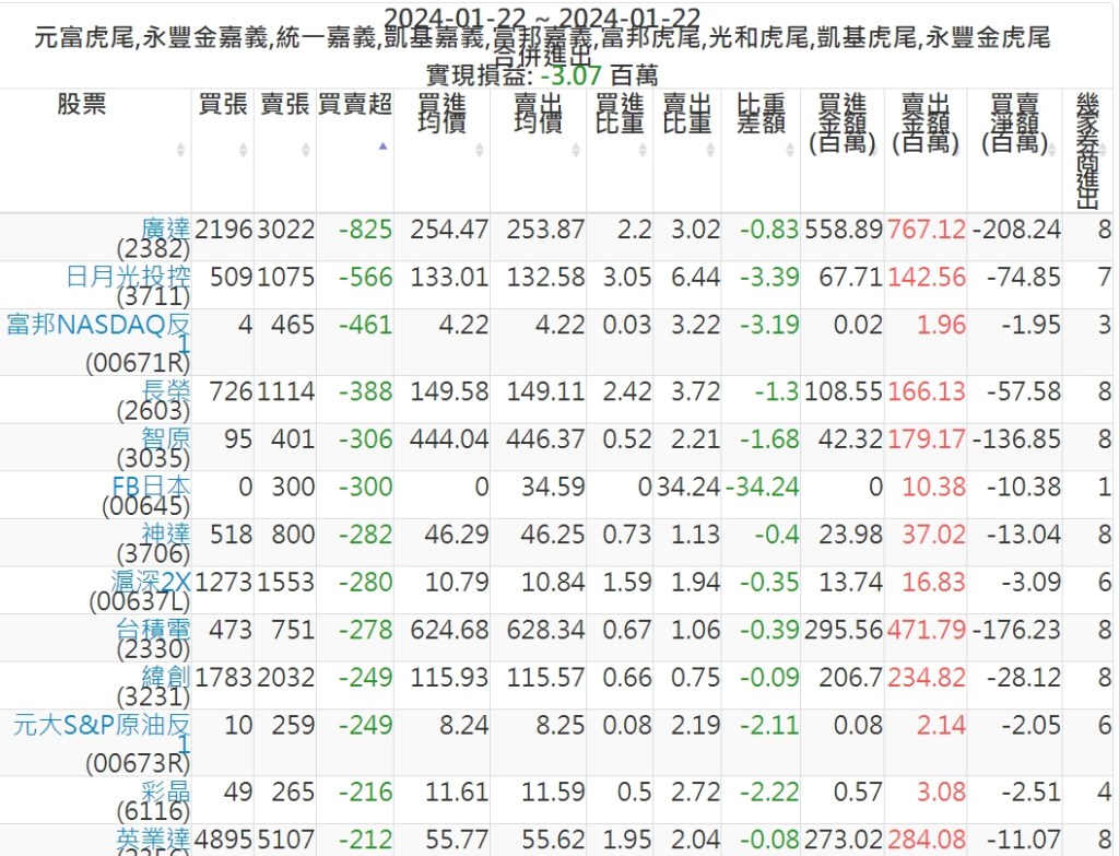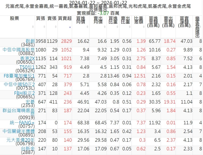 2024-0122主力買賣超個股 2024-01-22 股狗網小編 籌碼面每日資訊 發表留言 可參考下文 『如何查詢當沖、隔日沖分公司券商買賣』 主力當沖券商: 『元富虎尾』,『永豐金嘉義』,『統一嘉義』,『凱基嘉義』,『富邦嘉義』,『富邦虎尾』,『光和虎尾』,『凱基虎尾』,『永豐金虎尾』。 『當沖標的』 『買超股票』 『賣超股票』 免責宣言 本網站文章所提供資訊僅供參考,並無任何推介買賣之意,投資人應自行承擔交易風險。 分享此文: 分享到 X(在新視窗中開啟) X 分享到 Facebook(在新視窗中開啟) Facebook 喜歡 正在載入...