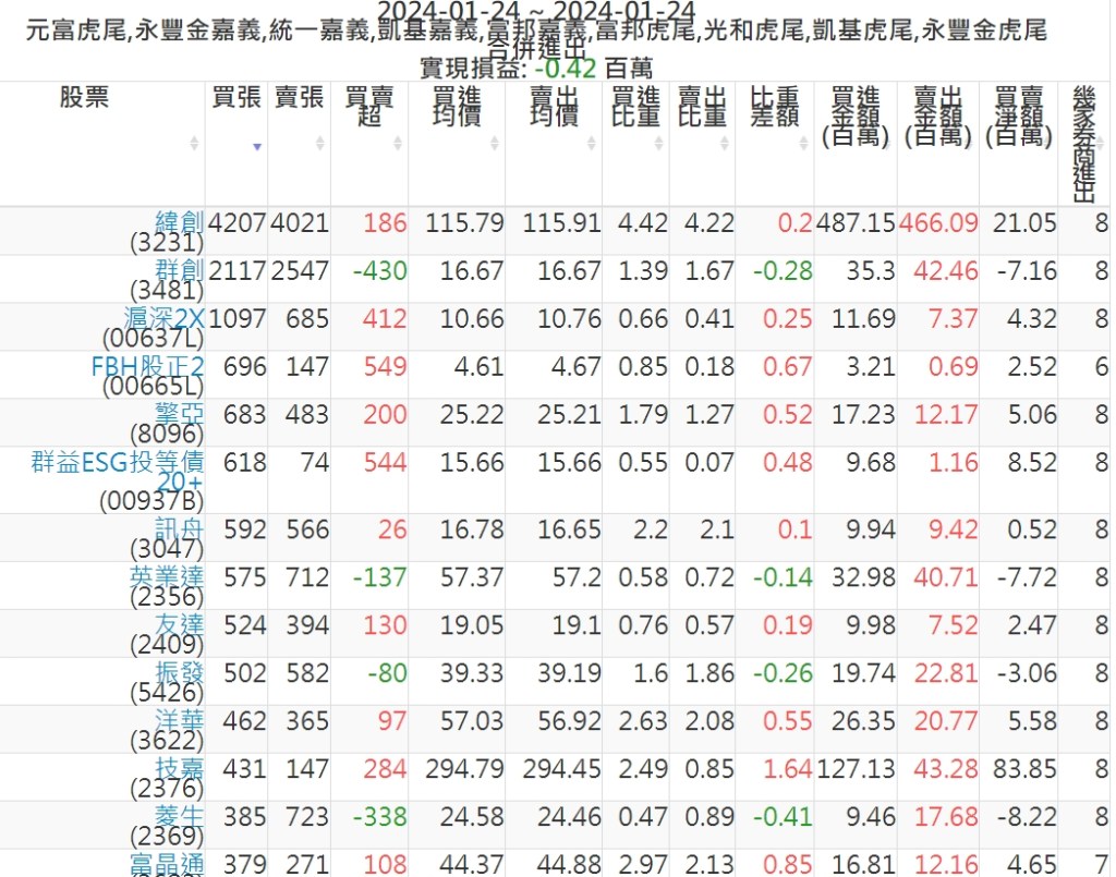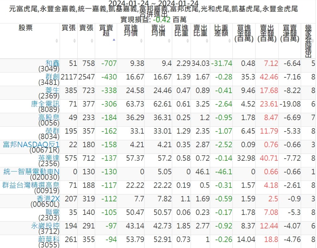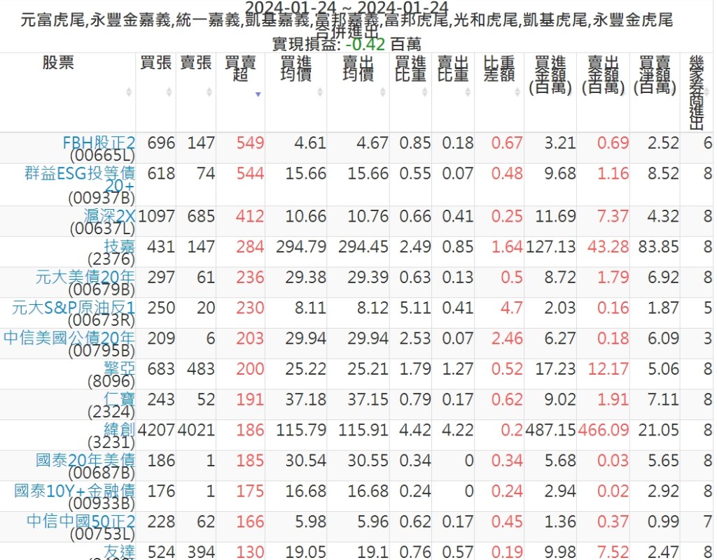 2024-0124主力買賣超個股 2024-01-24 股狗網小編 籌碼面每日資訊 發表留言 可參考下文 『如何查詢當沖、隔日沖分公司券商買賣』 主力當沖券商: 『元富虎尾』,『永豐金嘉義』,『統一嘉義』,『凱基嘉義』,『富邦嘉義』,『富邦虎尾』,『光和虎尾』,『凱基虎尾』,『永豐金虎尾』。 『當沖標的』 『買超股票』 『賣超股票』 免責宣言 本網站文章所提供資訊僅供參考,並無任何推介買賣之意,投資人應自行承擔交易風險。 分享此文: 分享到 X(在新視窗中開啟) X 分享到 Facebook(在新視窗中開啟) Facebook 喜歡 正在載入...