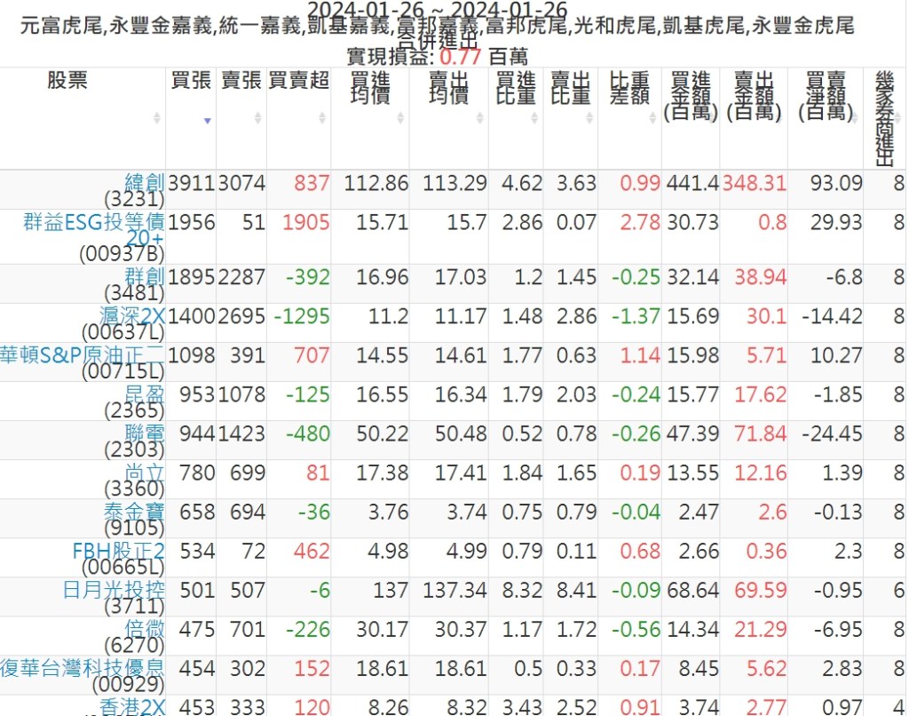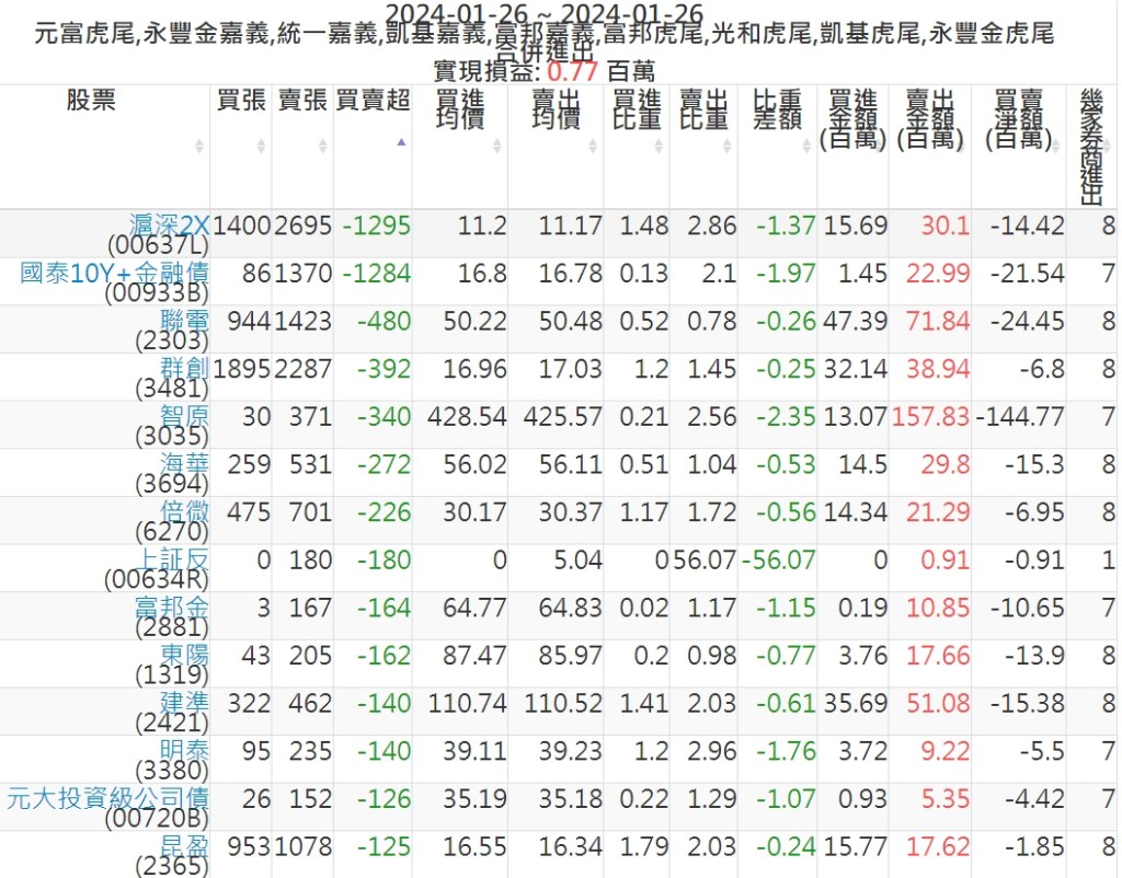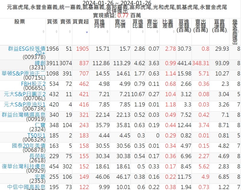2024-0126主力買賣超個股 2024-01-27 股狗網小編 籌碼面每日資訊 發表留言 可參考下文 『如何查詢當沖、隔日沖分公司券商買賣』 主力當沖券商: 『元富虎尾』,『永豐金嘉義』,『統一嘉義』,『凱基嘉義』,『富邦嘉義』,『富邦虎尾』,『光和虎尾』,『凱基虎尾』,『永豐金虎尾』。 『當沖標的』 『買超股票』 『賣超股票』 免責宣言 本網站文章所提供資訊僅供參考,並無任何推介買賣之意,投資人應自行承擔交易風險。 分享此文: 分享到 X(在新視窗中開啟) X 分享到 Facebook(在新視窗中開啟) Facebook 喜歡 正在載入...