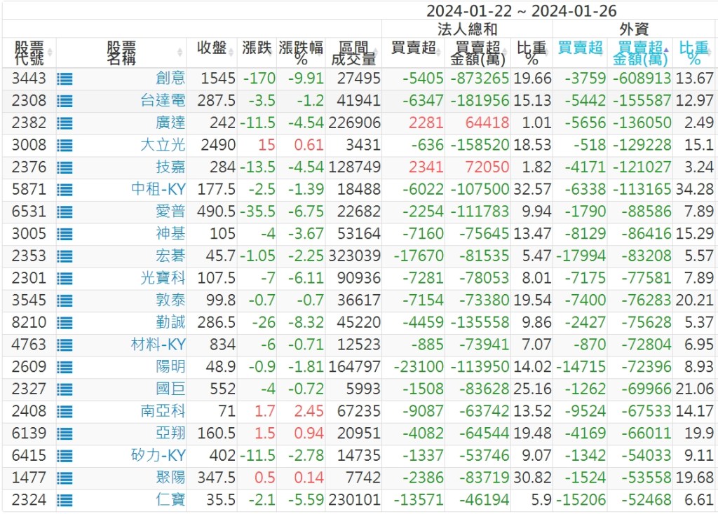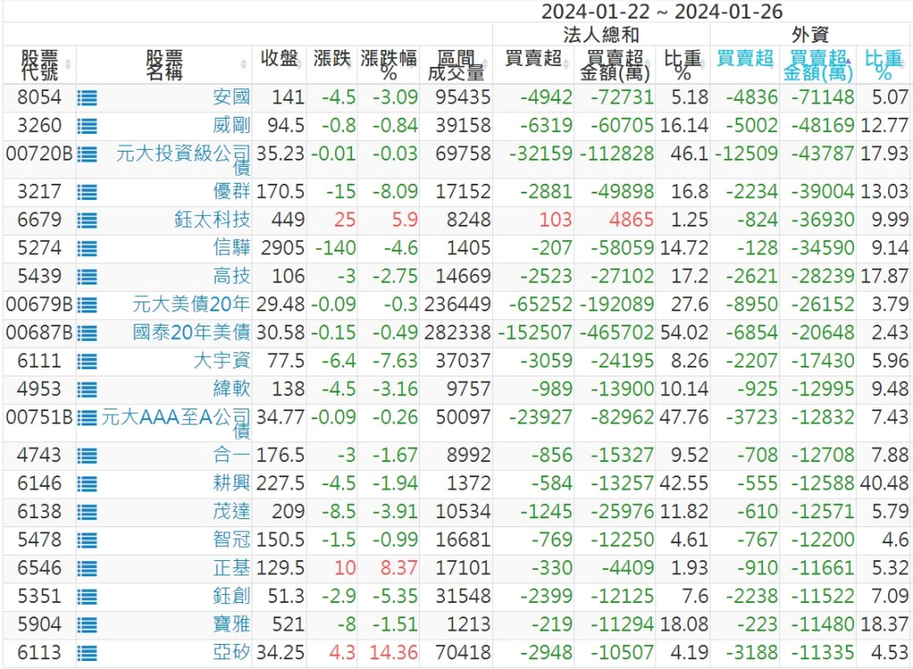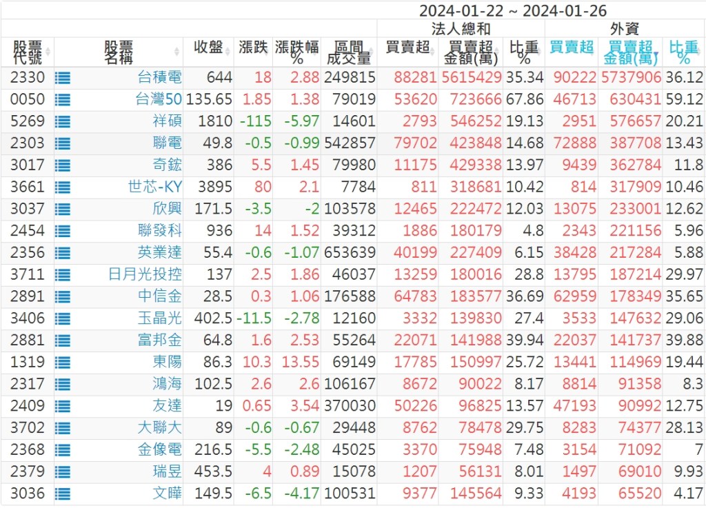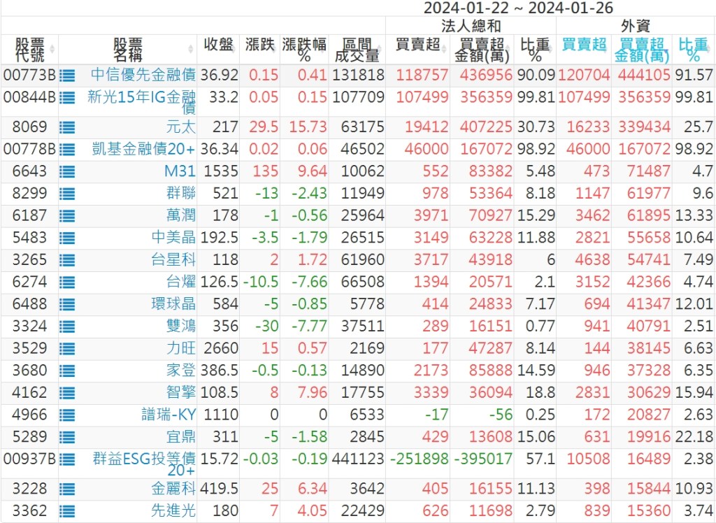 2024/01/22~2024/01/26近5日【外資】買賣超個股 2024-01-28 股狗網小編 投資誌-大盤 發表留言 投資達人APP上線囉!!!『安裝APP』: 外資本周累積【買超】約732億元。 【上市外資買超個股】(以金額排行,單位:萬) 【上市外資賣超個股】(以金額排行,單位:萬) 【上櫃外資買超個股】(以金額排行,單位:萬) 【上櫃外資賣超個股】(以金額排行,單位:萬) 免責宣言 本網站文章所提供資訊僅供參考,並無任何推介買賣之意,投資人應自行承擔交易風險。 分享此文: 分享到 X(在新視窗中開啟) X 分享到 Facebook(在新視窗中開啟) Facebook 喜歡 正在載入...