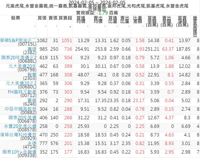 2024-0205主力買賣超個股 2024-02-05 股狗網小編 籌碼面每日資訊 發表留言 可參考下文 『如何查詢當沖、隔日沖分公司券商買賣』 主力當沖券商: 『元富虎尾』,『永豐金嘉義』,『統一嘉義』,『凱基嘉義』,『富邦嘉義』,『富邦虎尾』,『光和虎尾』,『凱基虎尾』,『永豐金虎尾』。 『當沖標的』 『買超股票』 『賣超股票』 免責宣言 本網站文章所提供資訊僅供參考,並無任何推介買賣之意,投資人應自行承擔交易風險。 分享此文: 按一下即可分享至 X(在新視窗中開啟) X 按一下以分享至 Facebook(在新視窗中開啟) Facebook 喜歡 正在載入...