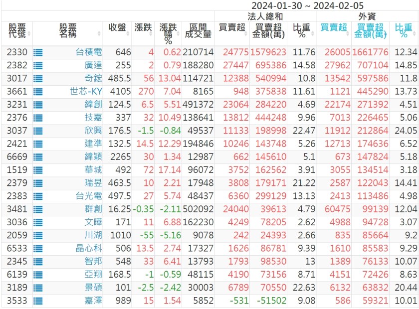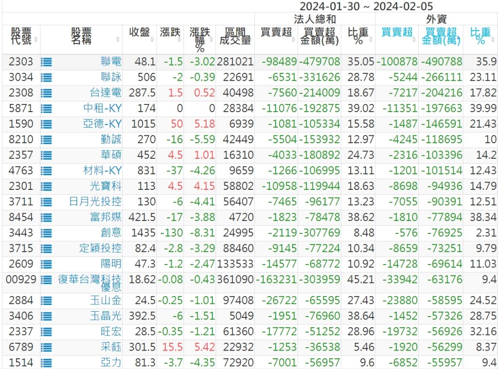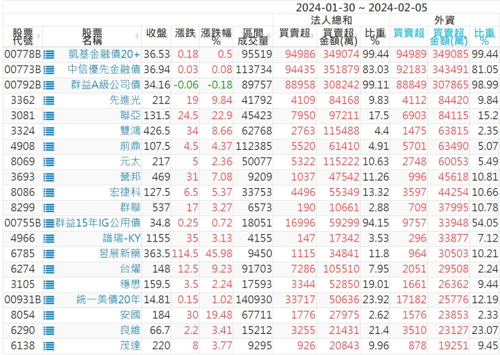 2024/01/30~2024/02/05近5日【外資】買賣超個股 2024-02-14 股狗網小編 投資誌-大盤 發表留言 外資本周累積【買超】約200億元。 【上市外資買超個股】(以金額排行,單位:萬) 【上市外資賣超個股】(以金額排行,單位:萬) 【上櫃外資買超個股】(以金額排行,單位:萬) 【上櫃外資賣超個股】(以金額排行,單位:萬) 免責宣言 本網站文章所提供資訊僅供參考,並無任何推介買賣之意,投資人應自行承擔交易風險。 分享此文: 按一下即可分享至 X(在新視窗中開啟) X 按一下以分享至 Facebook(在新視窗中開啟) Facebook 喜歡 正在載入...