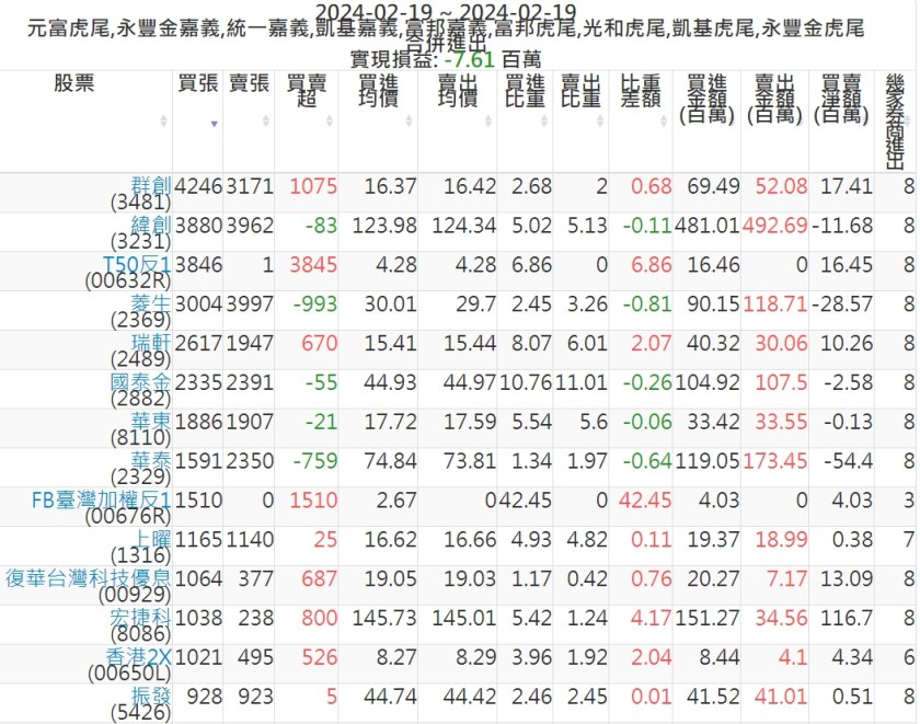 2024-0219主力買賣超個股 2024-02-19 股狗網小編 籌碼面每日資訊 發表留言 可參考下文 『如何查詢當沖、隔日沖分公司券商買賣』 主力當沖券商: 『元富虎尾』,『永豐金嘉義』,『統一嘉義』,『凱基嘉義』,『富邦嘉義』,『富邦虎尾』,『光和虎尾』,『凱基虎尾』,『永豐金虎尾』。 『當沖標的』 『買超股票』 『賣超股票』 免責宣言 本網站文章所提供資訊僅供參考,並無任何推介買賣之意,投資人應自行承擔交易風險。 分享此文: 按一下即可分享至 X(在新視窗中開啟) X 按一下以分享至 Facebook(在新視窗中開啟) Facebook 喜歡 正在載入...