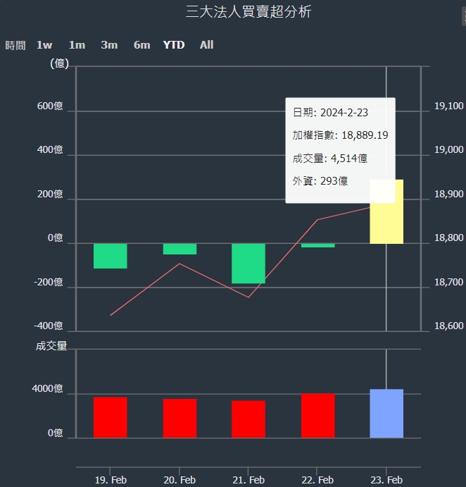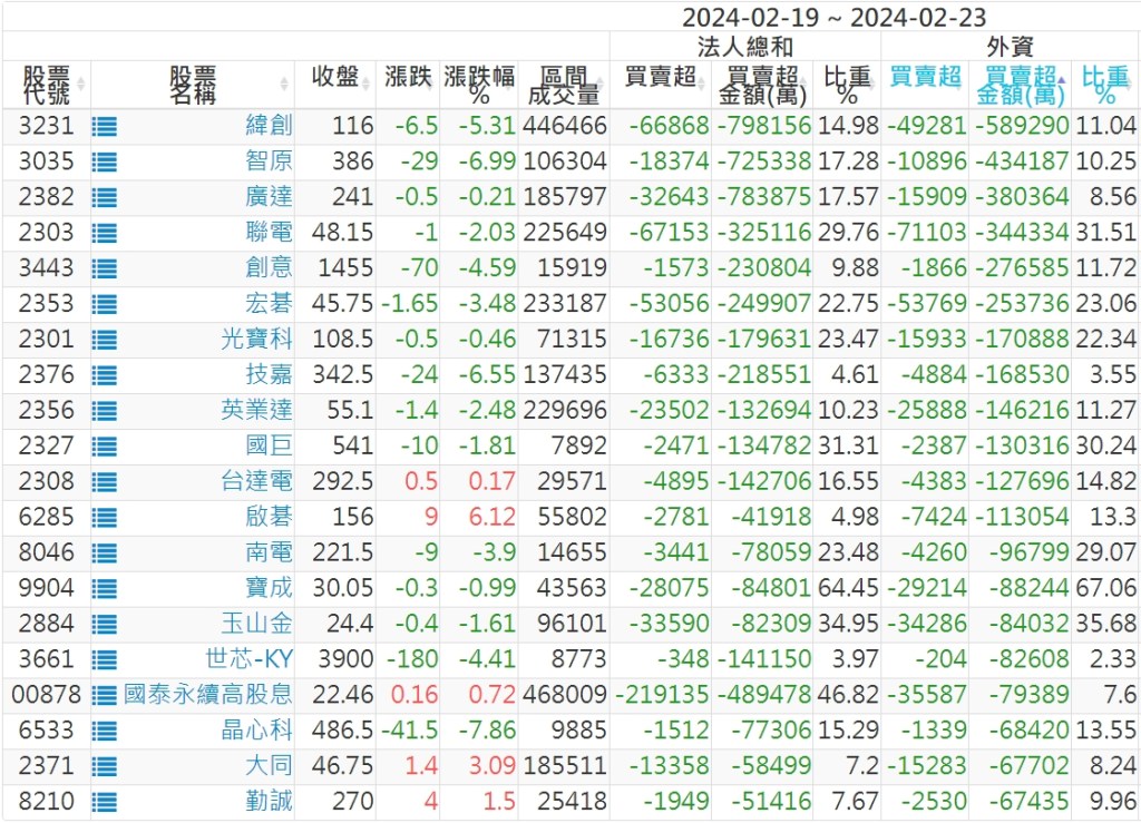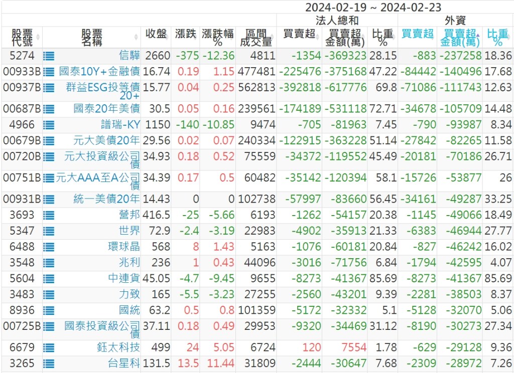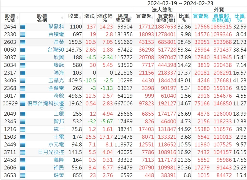 2024/02/19~2024/02/23近5日【外資】買賣超個股 2024-02-25 股狗網小編 投資誌-大盤 發表留言 外資本周累積【買超】約293億元。 【上市外資買超個股】(以金額排行,單位:萬) 【上市外資賣超個股】(以金額排行,單位:萬) 【上櫃外資買超個股】(以金額排行,單位:萬) 【上櫃外資賣超個股】(以金額排行,單位:萬) 免責宣言 本網站文章所提供資訊僅供參考,並無任何推介買賣之意,投資人應自行承擔交易風險。 分享此文: 分享到 X(在新視窗中開啟) X 分享到 Facebook(在新視窗中開啟) Facebook 喜歡 正在載入...