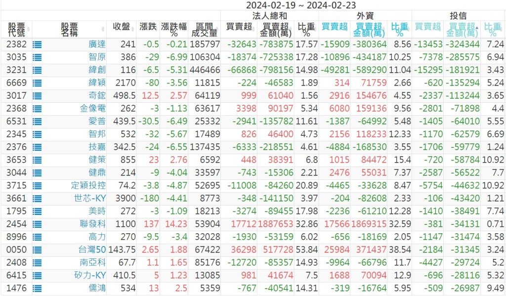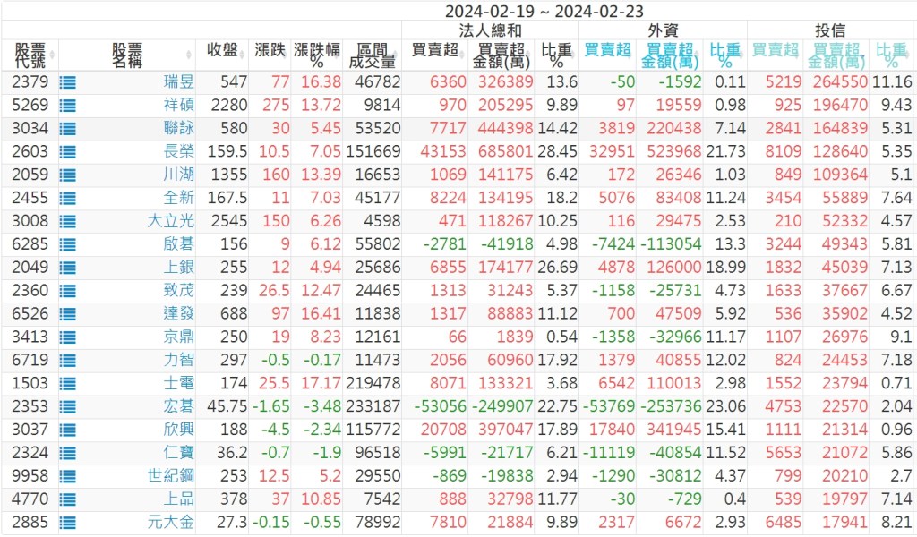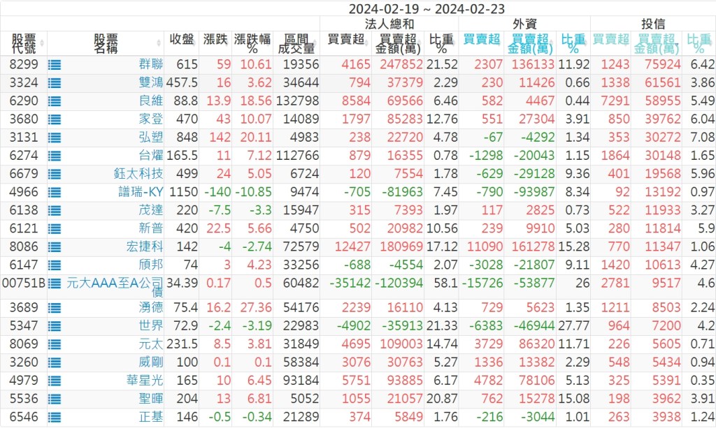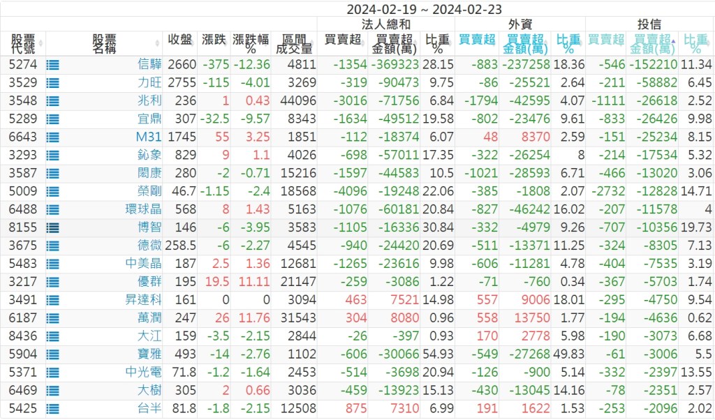 2024/02/19~2024/02/23近5日【投信】買賣超個股 2024-02-25 股狗網小編 投資誌-大盤 發表留言 【上市投信買超個股】(以金額排行,單位:萬) 【上市投信賣超個股】(以金額排行,單位:萬) 【上櫃投信買超個股】(以金額排行,單位:萬) 【上櫃投信賣超個股】(以金額排行,單位:萬) 免責宣言 本網站文章所提供資訊僅供參考,並無任何推介買賣之意,投資人應自行承擔交易風險。 分享此文: 分享到 X(在新視窗中開啟) X 分享到 Facebook(在新視窗中開啟) Facebook 喜歡 正在載入...