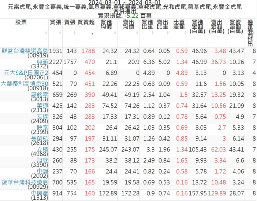 2024-0301主力買賣超個股 2024-03-01 股狗網小編 籌碼面每日資訊 發表留言 可參考下文 『如何查詢當沖、隔日沖分公司券商買賣』 主力當沖券商: 『元富虎尾』,『永豐金嘉義』,『統一嘉義』,『凱基嘉義』,『富邦嘉義』,『富邦虎尾』,『光和虎尾』,『凱基虎尾』,『永豐金虎尾』。 『當沖標的』 『買超股票』 『賣超股票』 免責宣言 本網站文章所提供資訊僅供參考,並無任何推介買賣之意,投資人應自行承擔交易風險。 分享此文: 分享到 X(在新視窗中開啟) X 分享到 Facebook(在新視窗中開啟) Facebook 喜歡 正在載入...