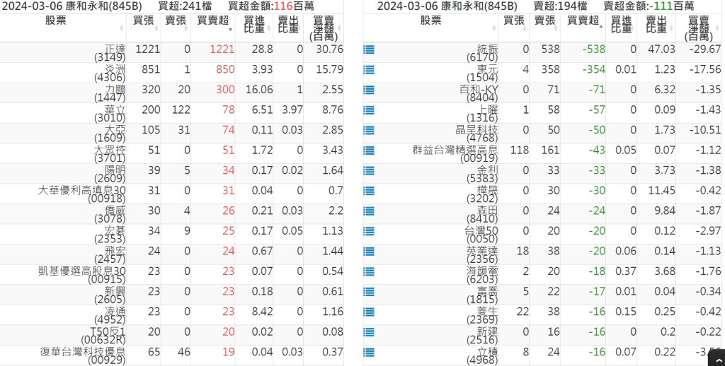 2024-0306關鍵券商買賣超 2024-03-06 股狗網小編 籌碼面每日資訊 發表留言 關鍵券商買賣超: 臺銀證券(1040): 台灣摩根士丹利(1470): 凱基台北(9268): 凱基信義(9216): 元大土城永寧(9875): 康和永和(845B) : 富邦建國(9658): 免責宣言 本網站文章所提供資訊僅供參考,並無任何推介買賣之意,投資人應自行承擔交易風險。 分享此文: 分享到 X(在新視窗中開啟) X 分享到 Facebook(在新視窗中開啟) Facebook 喜歡 正在載入...