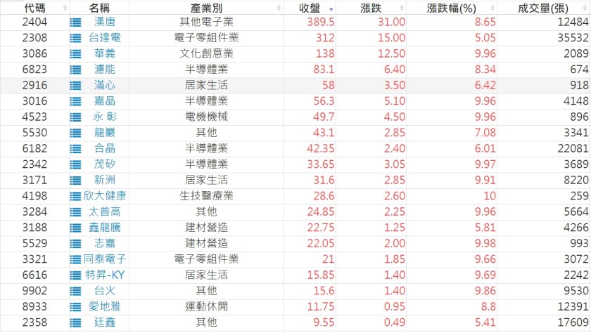 2024-0308日新高爆量上漲股 2024-03-08 股狗網小編 選股條件 發表留言 利用股狗選股的選股條件可以【挑選突破20日新高,爆量上漲起漲點股票】 1.股狗選股 https://www.stockdog.com.tw 2.選股條件: a.收盤價創20日新高 b.當日漲幅 > 2% C.成交量大於5日均量2倍 免責宣言 本網站文章所提供資訊僅供參考,並無任何推介買賣之意,投資人應自行承擔交易風險。 分享此文: 分享到 X(在新視窗中開啟) X 分享到 Facebook(在新視窗中開啟) Facebook 喜歡 正在載入...