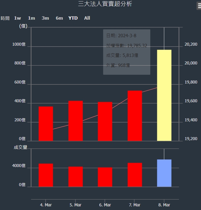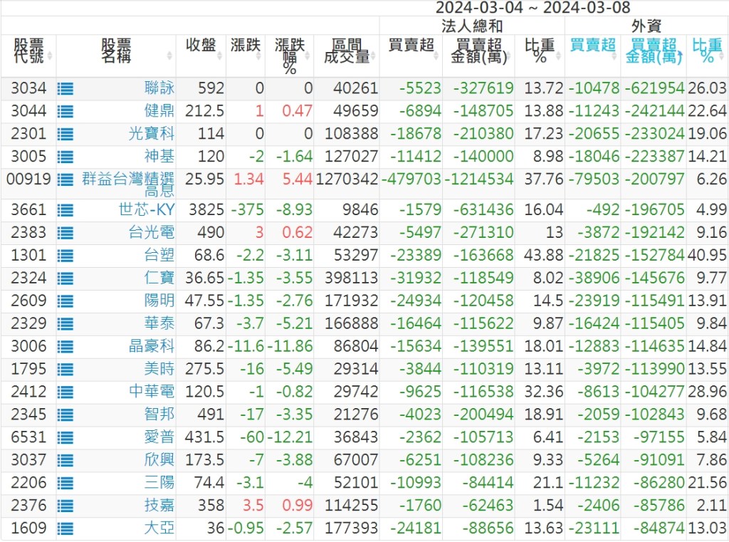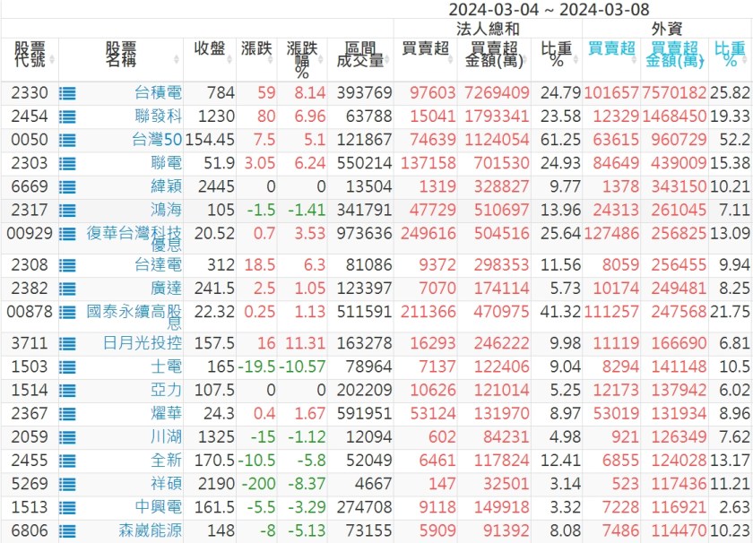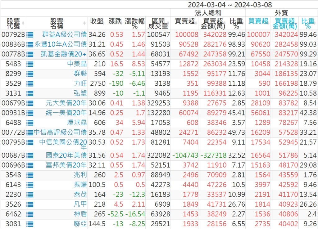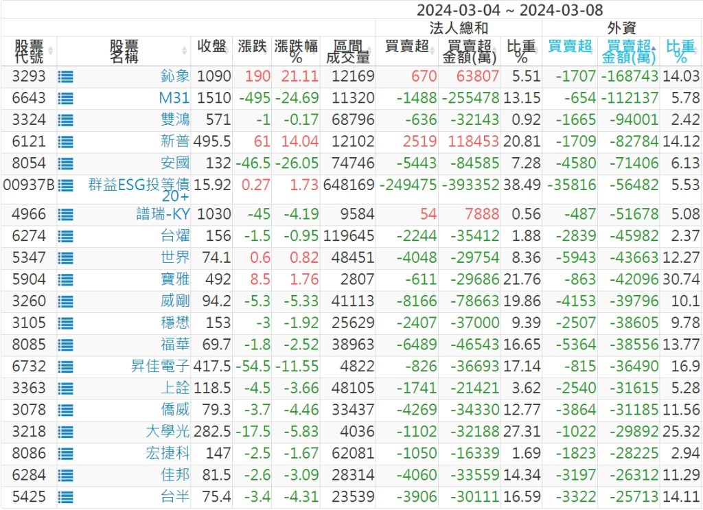 2024/03/04~2024/03/08近5日【外資】買賣超個股 2024-03-10 股狗網小編 投資誌-大盤 發表留言 外資本周累積【買超】約968億元。 【上市外資買超個股】(以金額排行,單位:萬) 【上市外資賣超個股】(以金額排行,單位:萬) 【上櫃外資買超個股】(以金額排行,單位:萬) 【上櫃外資賣超個股】(以金額排行,單位:萬) 免責宣言 本網站文章所提供資訊僅供參考,並無任何推介買賣之意,投資人應自行承擔交易風險。 分享此文: 分享到 X(在新視窗中開啟) X 分享到 Facebook(在新視窗中開啟) Facebook 喜歡 正在載入...