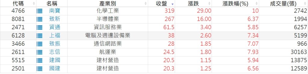 2024-0315日新高爆量上漲股 2024-03-16 股狗網小編 選股條件 發表留言 利用股狗選股的選股條件可以【挑選突破20日新高,爆量上漲起漲點股票】 1.股狗選股 https://www.stockdog.com.tw 2.選股條件: a.收盤價創20日新高 b.當日漲幅 > 2% C.成交量大於5日均量2倍 免責宣言 本網站文章所提供資訊僅供參考,並無任何推介買賣之意,投資人應自行承擔交易風險。 分享此文: 分享到 X(在新視窗中開啟) X 分享到 Facebook(在新視窗中開啟) Facebook 喜歡 正在載入...