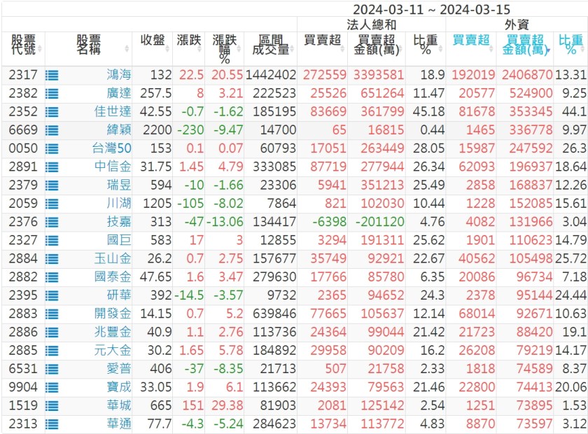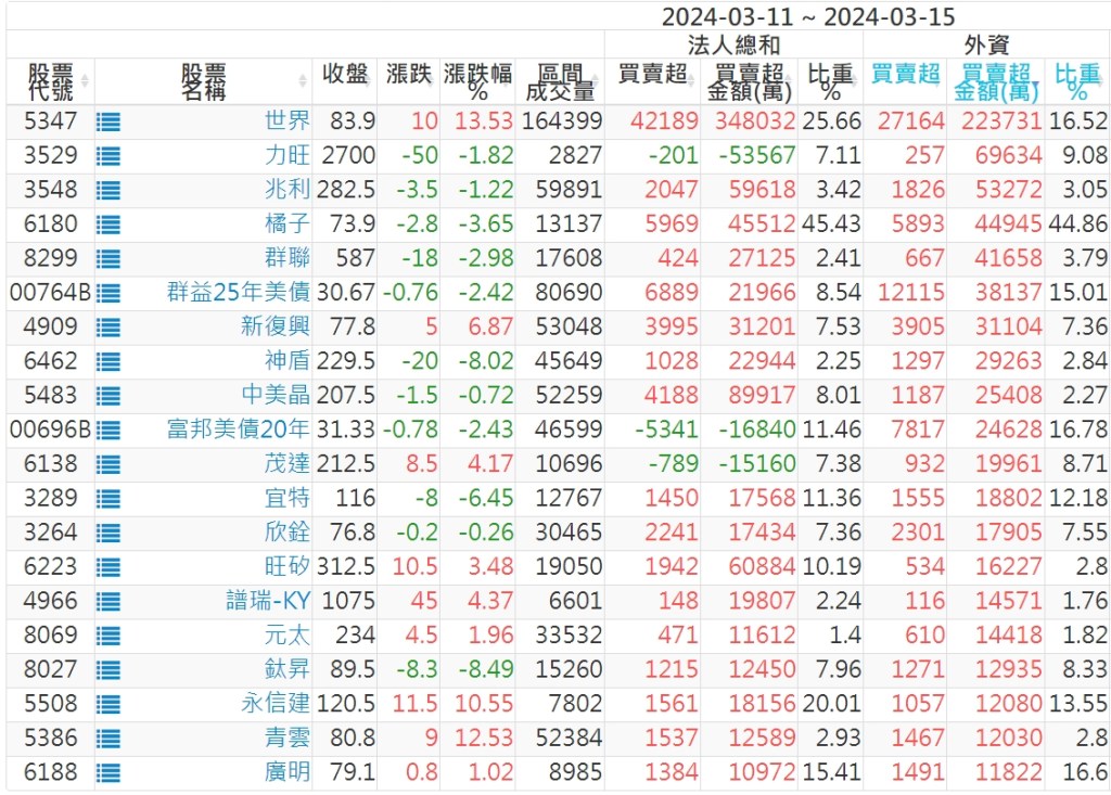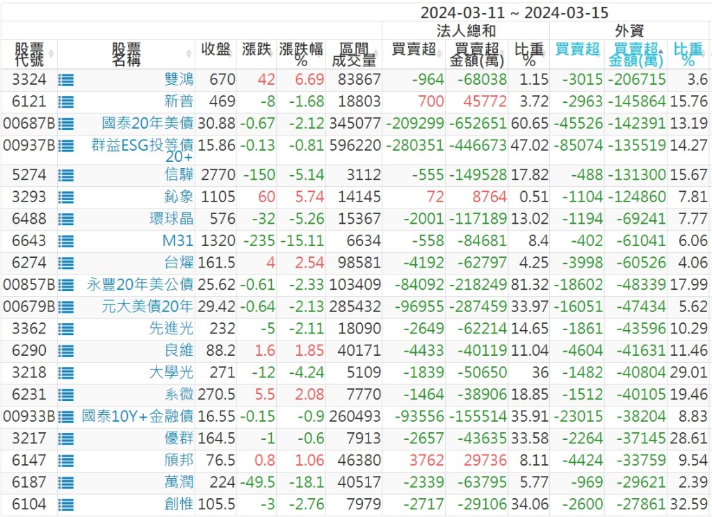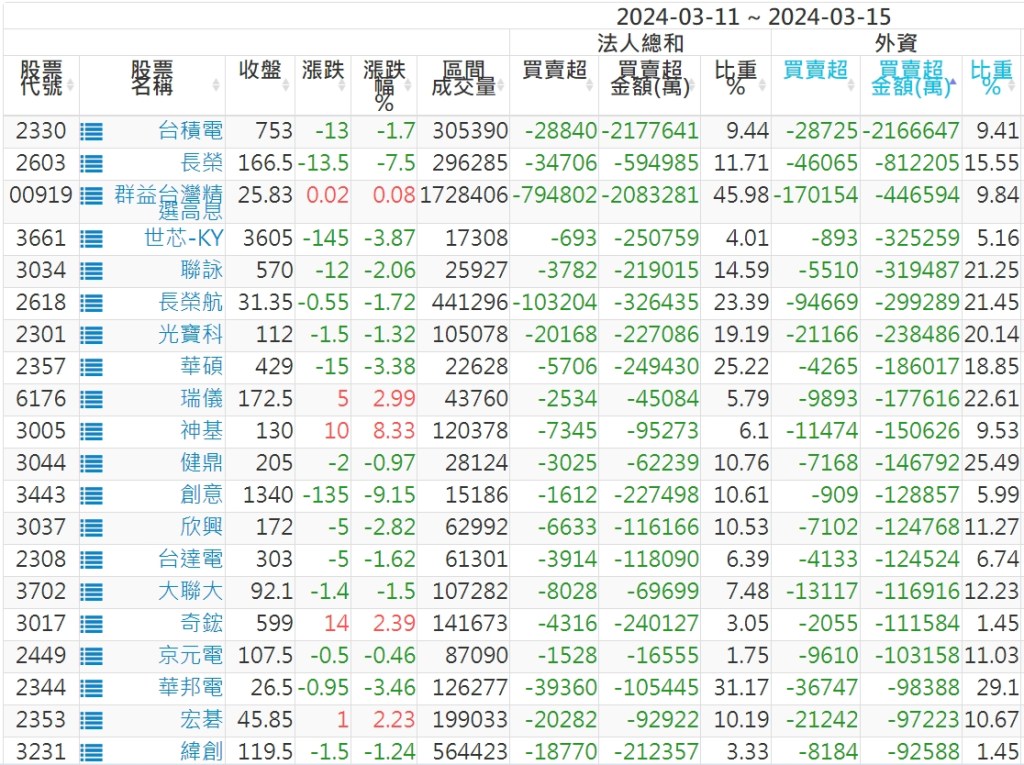 2024/03/11~2024/03/15近5日【外資】買賣超個股 2024-03-17 股狗網小編 投資誌-大盤 發表留言 外資本周累積【賣超】約72億元。 【上市外資買超個股】(以金額排行,單位:萬) 【上市外資賣超個股】(以金額排行,單位:萬) 【上櫃外資買超個股】(以金額排行,單位:萬) 【上櫃外資賣超個股】(以金額排行,單位:萬) 免責宣言 本網站文章所提供資訊僅供參考,並無任何推介買賣之意,投資人應自行承擔交易風險。 分享此文: 分享到 X(在新視窗中開啟) X 分享到 Facebook(在新視窗中開啟) Facebook 喜歡 正在載入...