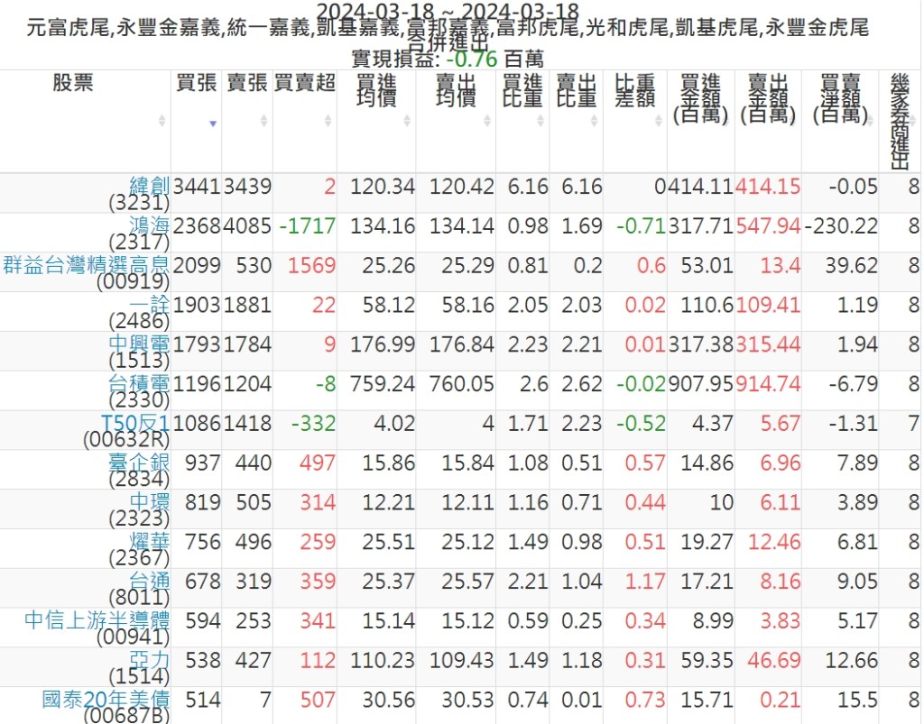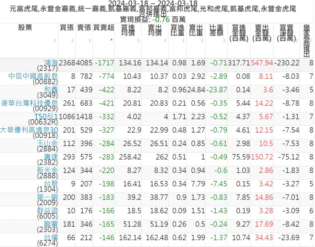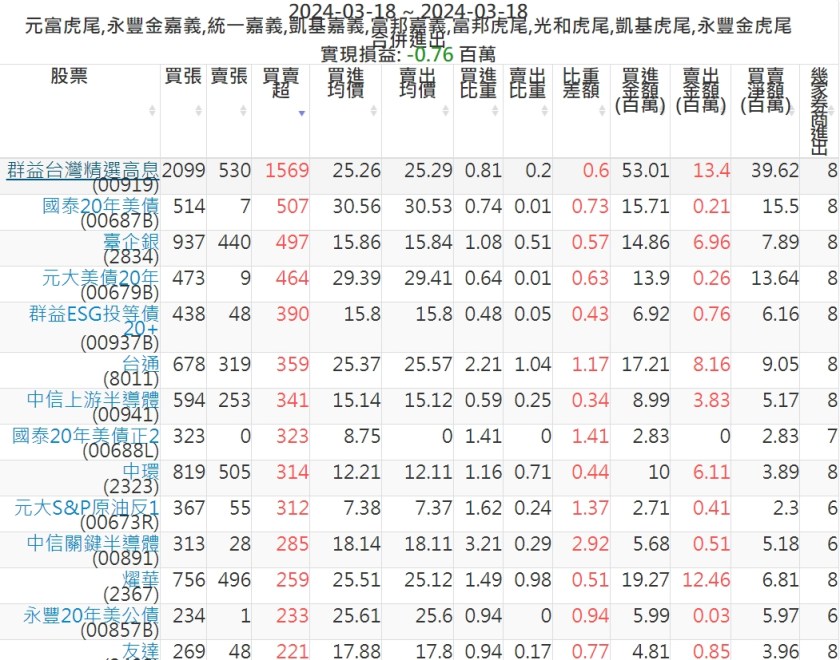 2024-0318主力買賣超個股 2024-03-18 股狗網小編 籌碼面每日資訊 發表留言 可參考下文 『如何查詢當沖、隔日沖分公司券商買賣』 主力當沖券商: 『元富虎尾』,『永豐金嘉義』,『統一嘉義』,『凱基嘉義』,『富邦嘉義』,『富邦虎尾』,『光和虎尾』,『凱基虎尾』,『永豐金虎尾』。 『當沖標的』 『買超股票』 『賣超股票』 免責宣言 本網站文章所提供資訊僅供參考,並無任何推介買賣之意,投資人應自行承擔交易風險。 分享此文: 分享到 X(在新視窗中開啟) X 分享到 Facebook(在新視窗中開啟) Facebook 喜歡 正在載入...