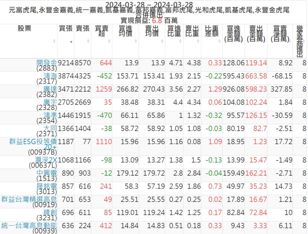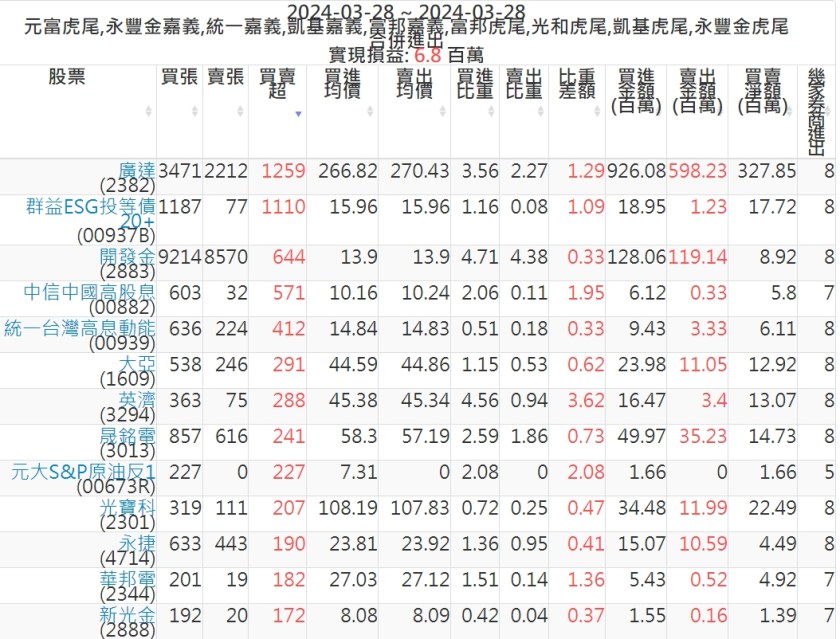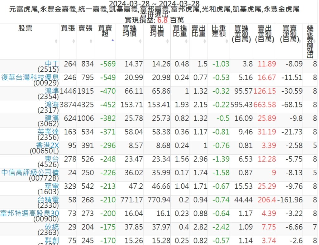 2024-0328主力買賣超個股 2024-03-28 股狗網小編 籌碼面每日資訊 發表留言 可參考下文 『如何查詢當沖、隔日沖分公司券商買賣』 主力當沖券商: 『元富虎尾』,『永豐金嘉義』,『統一嘉義』,『凱基嘉義』,『富邦嘉義』,『富邦虎尾』,『光和虎尾』,『凱基虎尾』,『永豐金虎尾』。 『當沖標的』 『買超股票』 『賣超股票』 免責宣言 本網站文章所提供資訊僅供參考,並無任何推介買賣之意,投資人應自行承擔交易風險。 分享此文: 分享到 X(在新視窗中開啟) X 分享到 Facebook(在新視窗中開啟) Facebook 喜歡 正在載入...