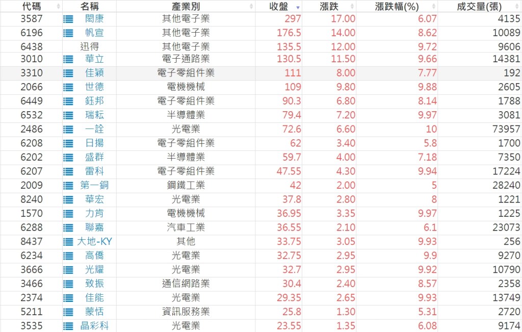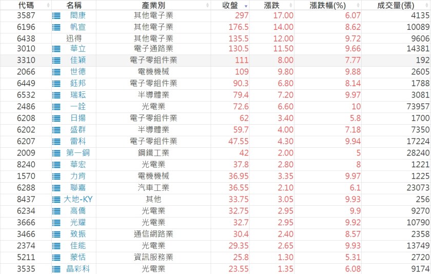 2024-0402日新高爆量上漲股 2024-04-02 股狗網小編 選股條件 發表留言 利用股狗選股的選股條件可以【挑選突破20日新高,爆量上漲起漲點股票】 1.股狗選股 https://www.stockdog.com.tw 2.選股條件: a.收盤價創20日新高 b.當日漲幅 > 2% C.成交量大於5日均量2倍 免責宣言 本網站文章所提供資訊僅供參考,並無任何推介買賣之意,投資人應自行承擔交易風險。 分享此文: 分享到 X(在新視窗中開啟) X 分享到 Facebook(在新視窗中開啟) Facebook 喜歡 正在載入...