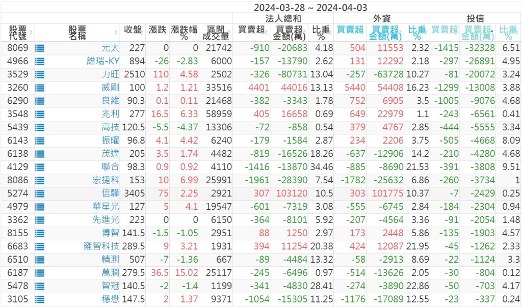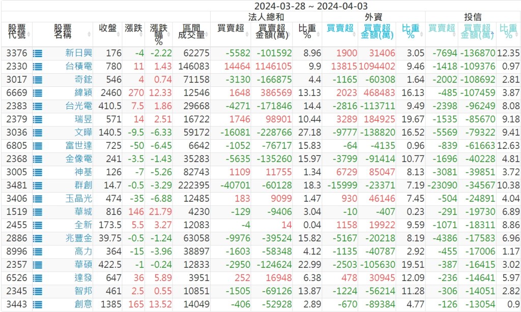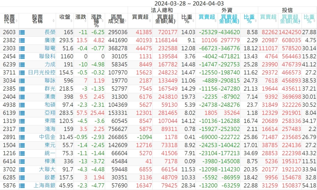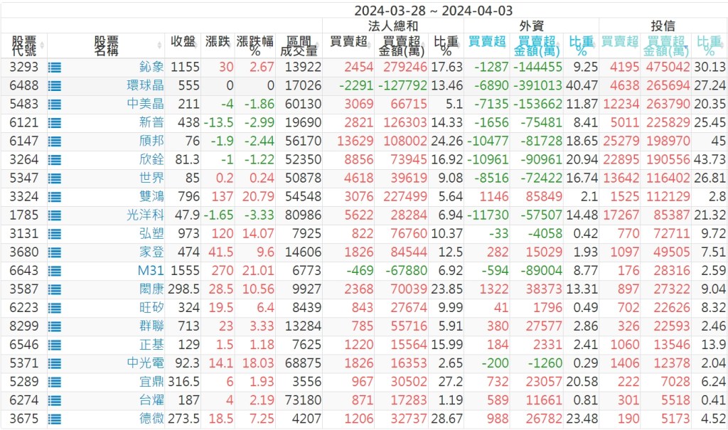 2024/03/28~2024/04/03近5日【投信】買賣超個股 2024-04-07 股狗網小編 投資誌-大盤 發表留言 【上市投信買超個股】(以金額排行,單位:萬) 【上市投信賣超個股】(以金額排行,單位:萬) 【上櫃投信買超個股】(以金額排行,單位:萬) 【上櫃投信賣超個股】(以金額排行,單位:萬) 免責宣言 本網站文章所提供資訊僅供參考,並無任何推介買賣之意,投資人應自行承擔交易風險。 分享此文: 分享到 X(在新視窗中開啟) X 分享到 Facebook(在新視窗中開啟) Facebook 喜歡 正在載入...