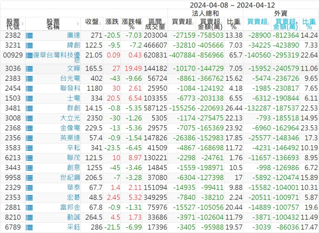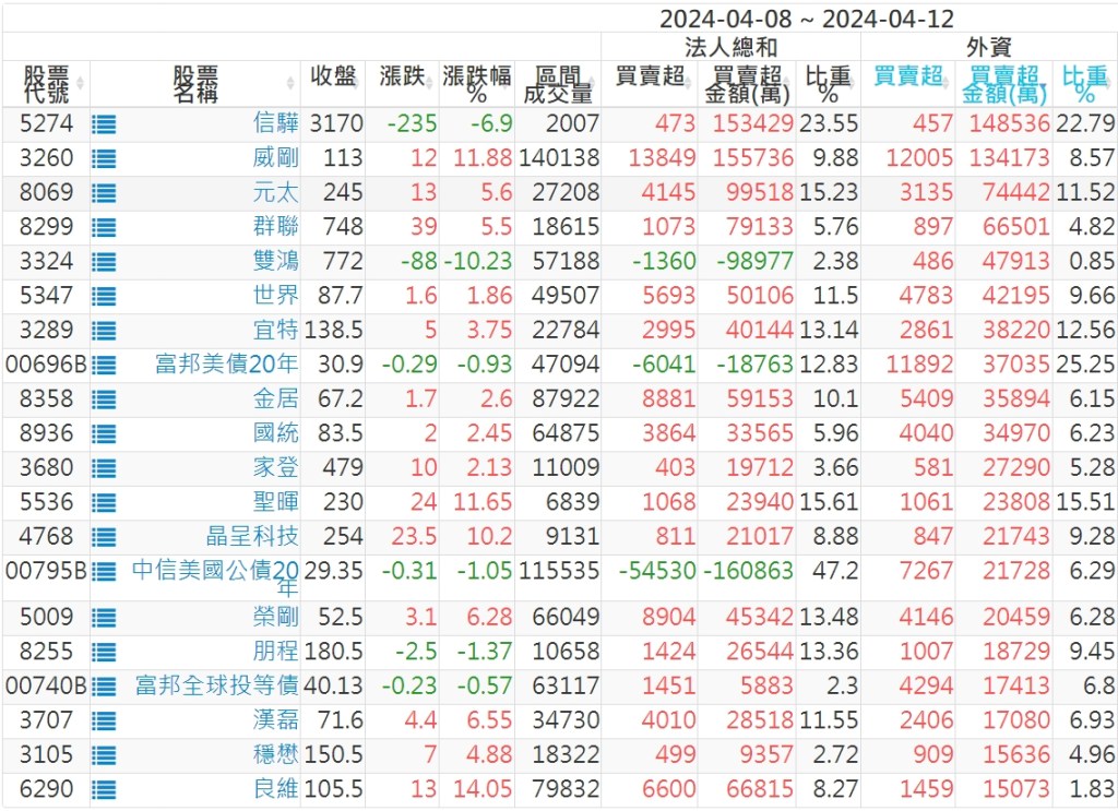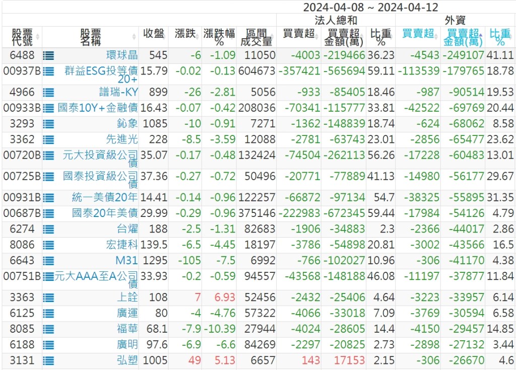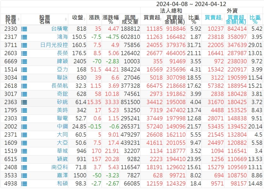 2024/04/08~2024/04/12近5日【外資】買賣超個股 2024-04-14 股狗網小編 投資誌-大盤 發表留言 外資本周累積【賣超】約46億元。 【上市外資買超個股】(以金額排行,單位:萬) 【上市外資賣超個股】(以金額排行,單位:萬) 【上櫃外資買超個股】(以金額排行,單位:萬) 【上櫃外資賣超個股】(以金額排行,單位:萬) 免責宣言 本網站文章所提供資訊僅供參考,並無任何推介買賣之意,投資人應自行承擔交易風險。 分享此文: 按一下即可分享至 X(在新視窗中開啟) X 按一下以分享至 Facebook(在新視窗中開啟) Facebook 喜歡 正在載入...