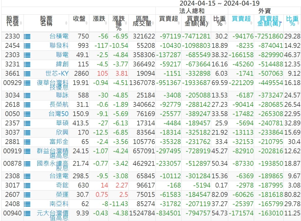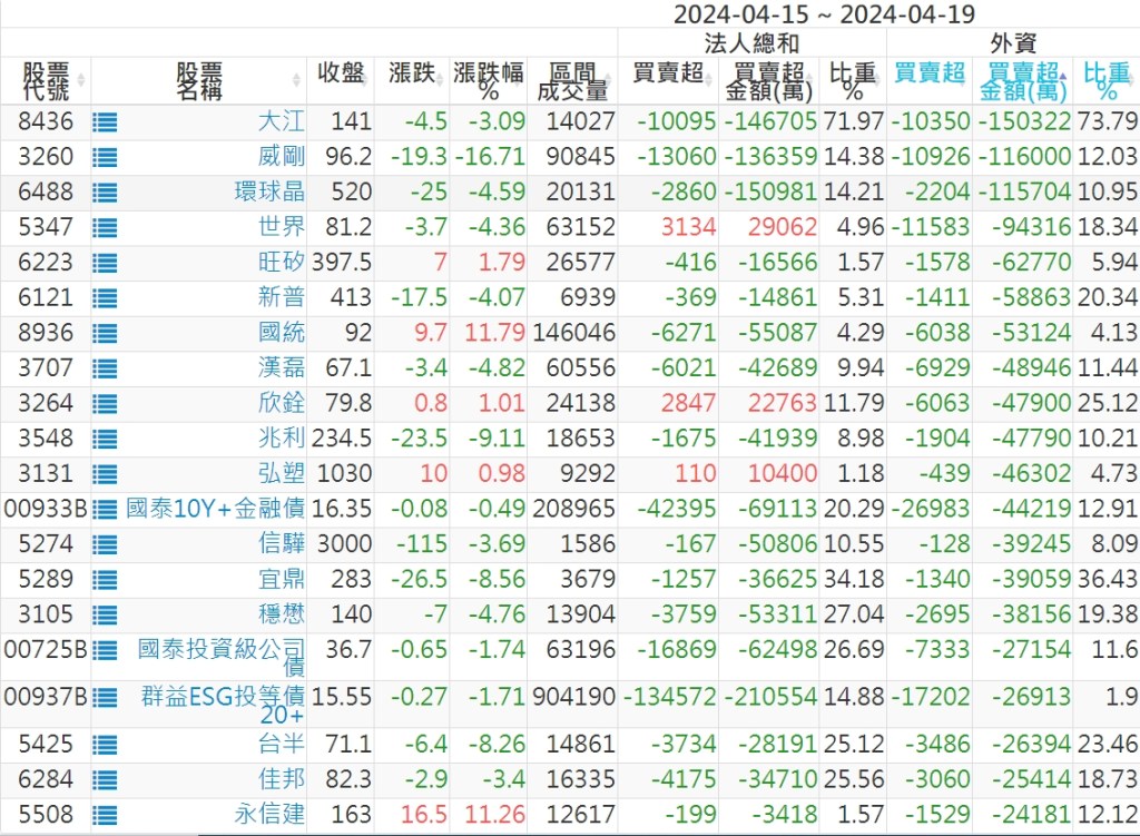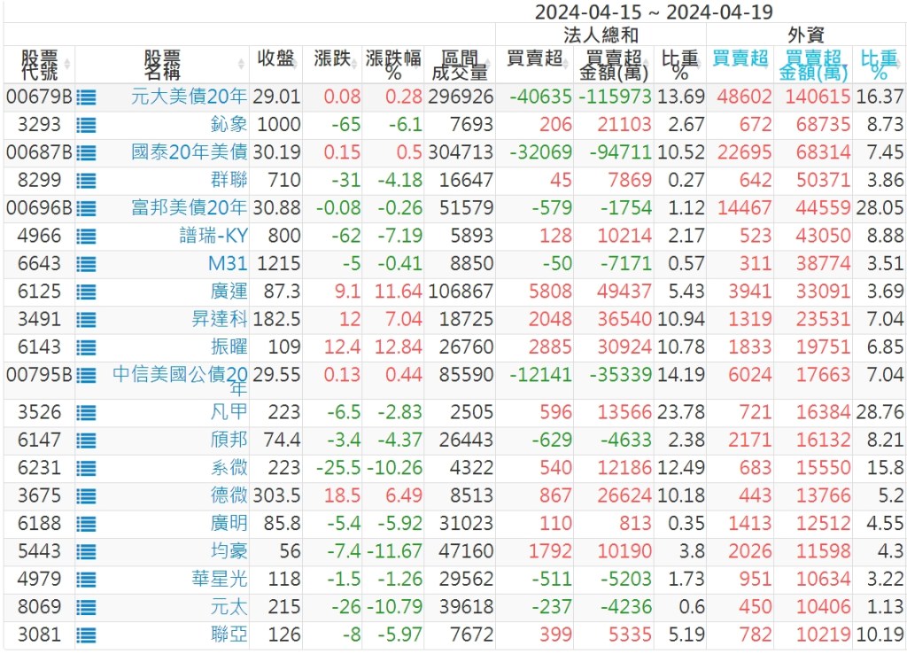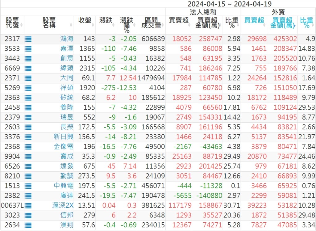 2024/04/15~2024/04/19近5日【外資】買賣超個股 2024-04-21 股狗網小編 投資誌-大盤 發表留言 外資本周累積【賣超】約858億元。 【上市外資買超個股】(以金額排行,單位:萬) 【上市外資賣超個股】(以金額排行,單位:萬) 【上櫃外資買超個股】(以金額排行,單位:萬) 【上櫃外資賣超個股】(以金額排行,單位:萬) 免責宣言 本網站文章所提供資訊僅供參考,並無任何推介買賣之意,投資人應自行承擔交易風險。 分享此文: 分享到 X(在新視窗中開啟) X 分享到 Facebook(在新視窗中開啟) Facebook 喜歡 正在載入...