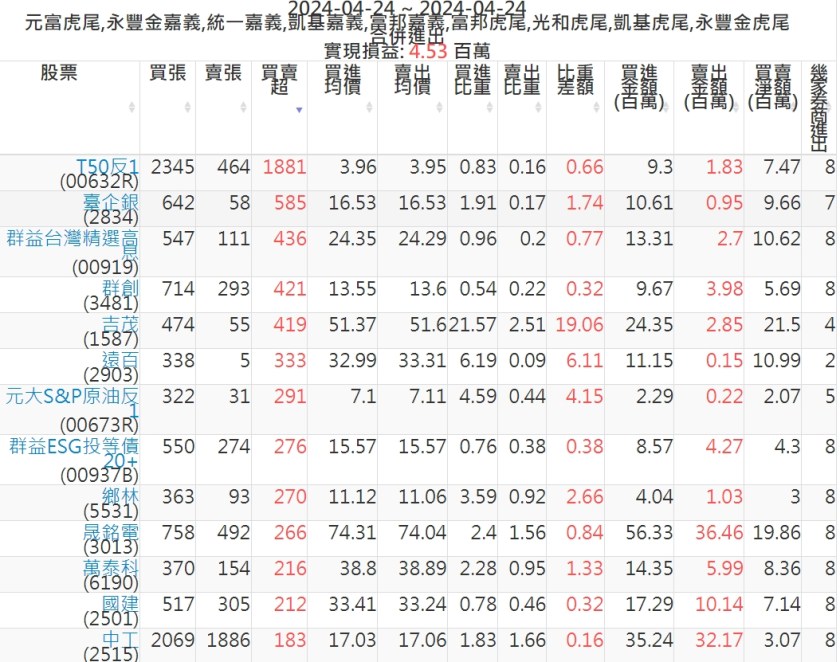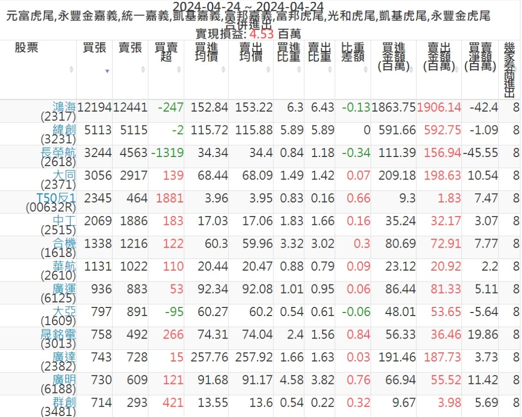 2024-0424主力買賣超個股 2024-04-24 股狗網小編 籌碼面每日資訊 發表留言 可參考下文 『如何查詢當沖、隔日沖分公司券商買賣』 主力當沖券商: 『元富虎尾』,『永豐金嘉義』,『統一嘉義』,『凱基嘉義』,『富邦嘉義』,『富邦虎尾』,『光和虎尾』,『凱基虎尾』,『永豐金虎尾』。 『當沖標的』 『買超股票』 『賣超股票』 免責宣言 本網站文章所提供資訊僅供參考,並無任何推介買賣之意,投資人應自行承擔交易風險。 分享此文: 分享到 X(在新視窗中開啟) X 分享到 Facebook(在新視窗中開啟) Facebook 喜歡 正在載入...