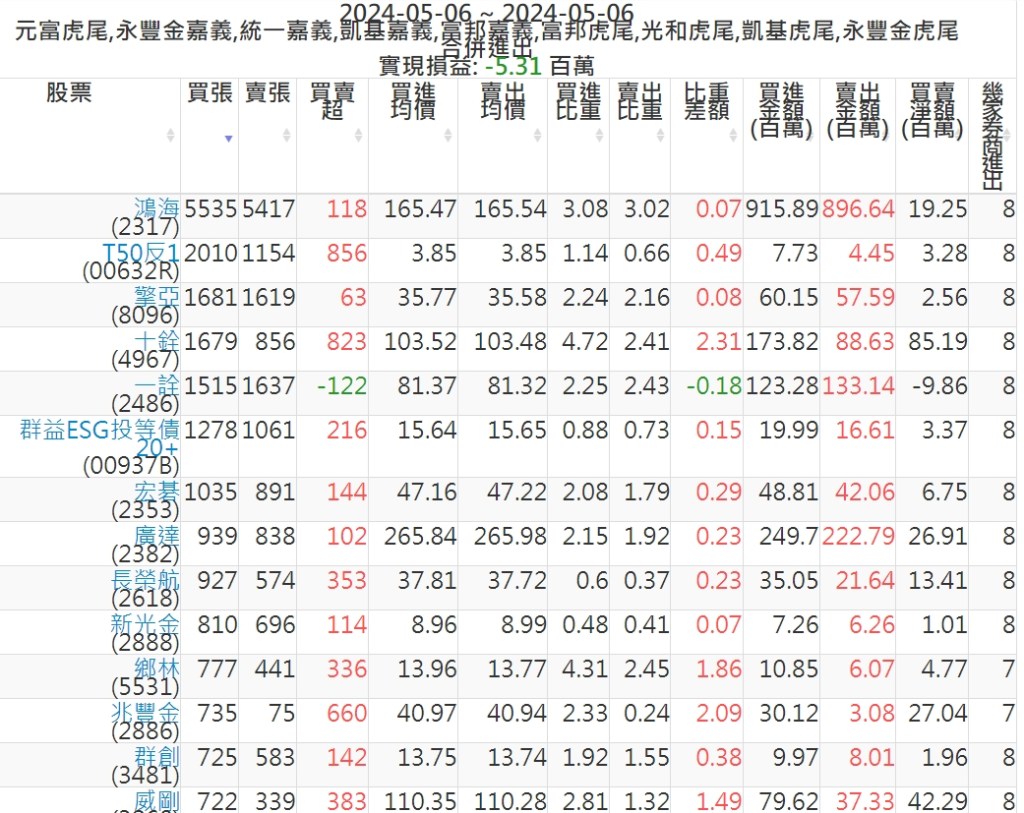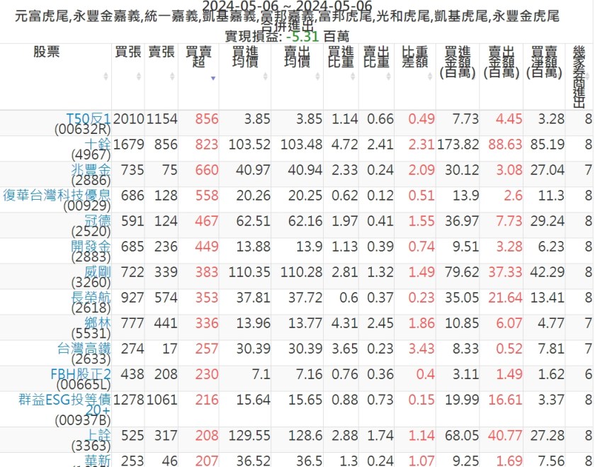 2024-0506主力買賣超個股 2024-05-06 股狗網小編 籌碼面每日資訊 發表留言 可參考下文 『如何查詢當沖、隔日沖分公司券商買賣』 主力當沖券商: 『元富虎尾』,『永豐金嘉義』,『統一嘉義』,『凱基嘉義』,『富邦嘉義』,『富邦虎尾』,『光和虎尾』,『凱基虎尾』,『永豐金虎尾』。 『當沖標的』 『買超股票』 『賣超股票』 免責宣言 本網站文章所提供資訊僅供參考,並無任何推介買賣之意,投資人應自行承擔交易風險。 分享此文: 分享到 X(在新視窗中開啟) X 分享到 Facebook(在新視窗中開啟) Facebook 喜歡 正在載入...