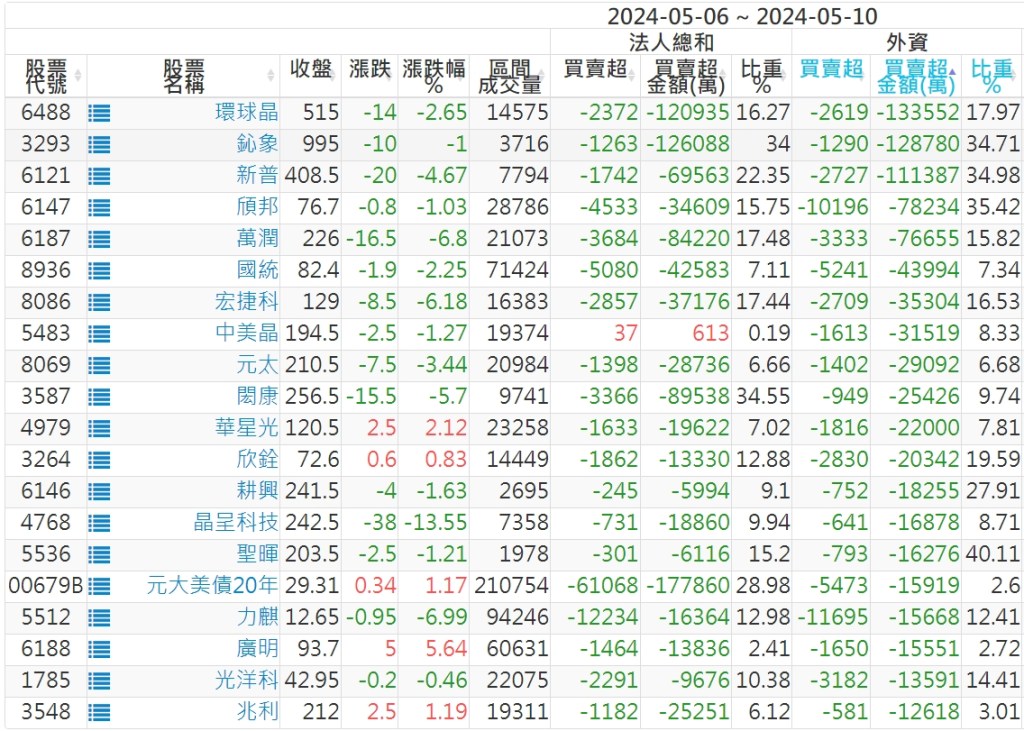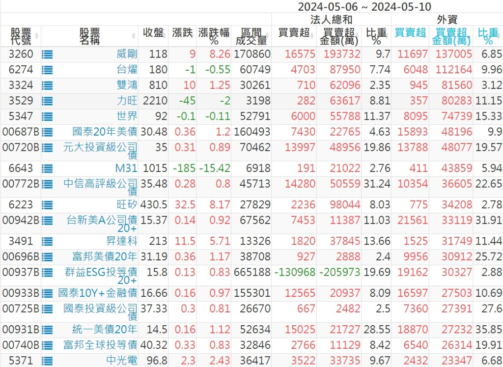 2024/05/06~2024/05/10近5日【外資】買賣超個股 2024-05-12 股狗網小編 投資誌-大盤 發表留言 外資本周累積【買超】約271億元。 【上市外資買超個股】(以金額排行,單位:萬) 【上市外資賣超個股】(以金額排行,單位:萬) 【上櫃外資買超個股】(以金額排行,單位:萬) 【上櫃外資賣超個股】(以金額排行,單位:萬) 免責宣言 本網站文章所提供資訊僅供參考,並無任何推介買賣之意,投資人應自行承擔交易風險。 分享此文: 按一下即可分享至 X(在新視窗中開啟) X 按一下以分享至 Facebook(在新視窗中開啟) Facebook 喜歡 正在載入...