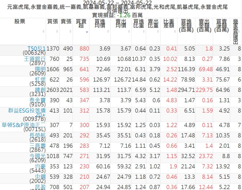 2024-0522主力買賣超個股 2024-05-22 股狗網小編 籌碼面每日資訊 發表留言 可參考下文 『如何查詢當沖、隔日沖分公司券商買賣』 主力當沖券商: 『元富虎尾』,『永豐金嘉義』,『統一嘉義』,『凱基嘉義』,『富邦嘉義』,『富邦虎尾』,『光和虎尾』,『凱基虎尾』,『永豐金虎尾』。 『當沖標的』 『買超股票』 『賣超股票』 免責宣言 本網站文章所提供資訊僅供參考,並無任何推介買賣之意,投資人應自行承擔交易風險。 分享此文: 按一下即可分享至 X(在新視窗中開啟) X 按一下以分享至 Facebook(在新視窗中開啟) Facebook 喜歡 正在載入...