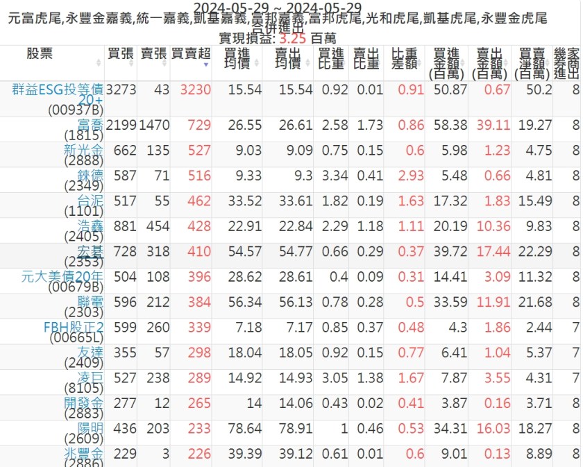 2024-0529主力買賣超個股 2024-05-29 股狗網小編 籌碼面每日資訊 發表留言 可參考下文 『如何查詢當沖、隔日沖分公司券商買賣』 主力當沖券商: 『元富虎尾』,『永豐金嘉義』,『統一嘉義』,『凱基嘉義』,『富邦嘉義』,『富邦虎尾』,『光和虎尾』,『凱基虎尾』,『永豐金虎尾』。 『當沖標的』 『買超股票』 『賣超股票』 免責宣言 本網站文章所提供資訊僅供參考,並無任何推介買賣之意,投資人應自行承擔交易風險。 分享此文: 按一下即可分享至 X(在新視窗中開啟) X 按一下以分享至 Facebook(在新視窗中開啟) Facebook 喜歡 正在載入...