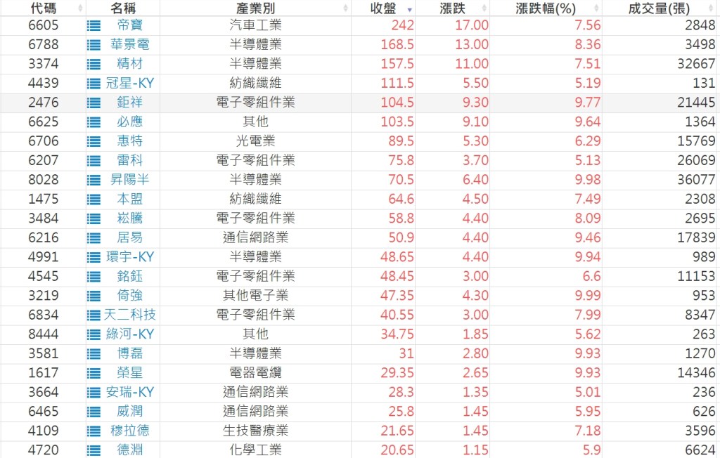 2024-0612日新高爆量上漲股 2024-06-12 股狗網小編 選股條件 發表留言 利用股狗選股的選股條件可以【挑選突破20日新高,爆量上漲起漲點股票】 1.股狗選股 https://www.stockdog.com.tw 2.選股條件: a.收盤價創20日新高 b.當日漲幅 > 2% C.成交量大於5日均量2倍 免責宣言 本網站文章所提供資訊僅供參考,並無任何推介買賣之意,投資人應自行承擔交易風險。 分享此文: 分享到 X(在新視窗中開啟) X 分享到 Facebook(在新視窗中開啟) Facebook 喜歡 正在載入...