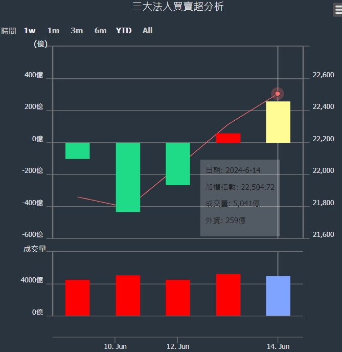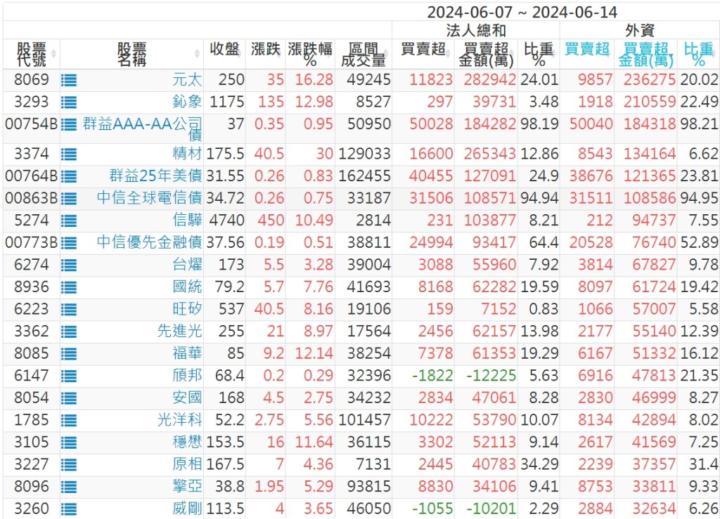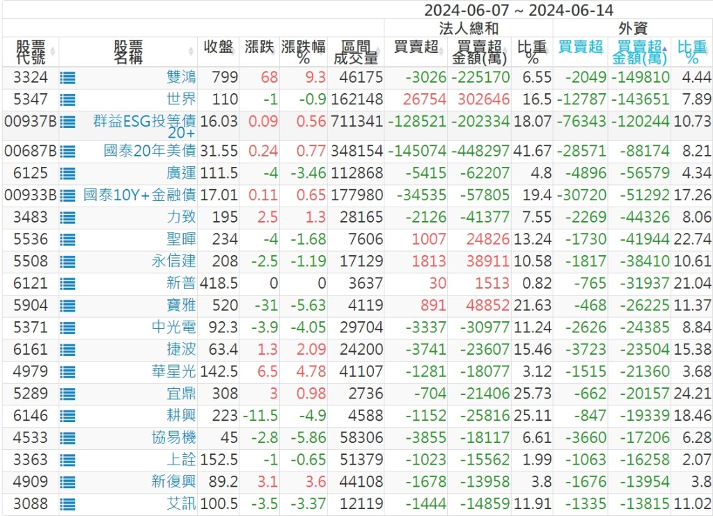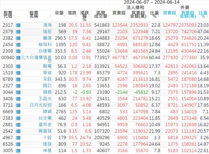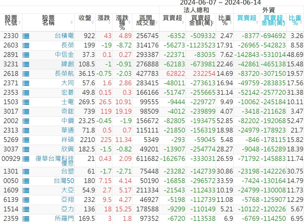 2024/06/07~2024/06/14近5日【外資】買賣超個股 2024-06-16 股狗網小編 投資誌-大盤 發表留言 外資本周累積【買超】約259億元。 【上市外資買超個股】(以金額排行,單位:萬) 【上市外資賣超個股】(以金額排行,單位:萬) 【上櫃外資買超個股】(以金額排行,單位:萬) 【上櫃外資賣超個股】(以金額排行,單位:萬) 免責宣言 本網站文章所提供資訊僅供參考,並無任何推介買賣之意,投資人應自行承擔交易風險。 分享此文: 分享到 X(在新視窗中開啟) X 分享到 Facebook(在新視窗中開啟) Facebook 喜歡 正在載入...