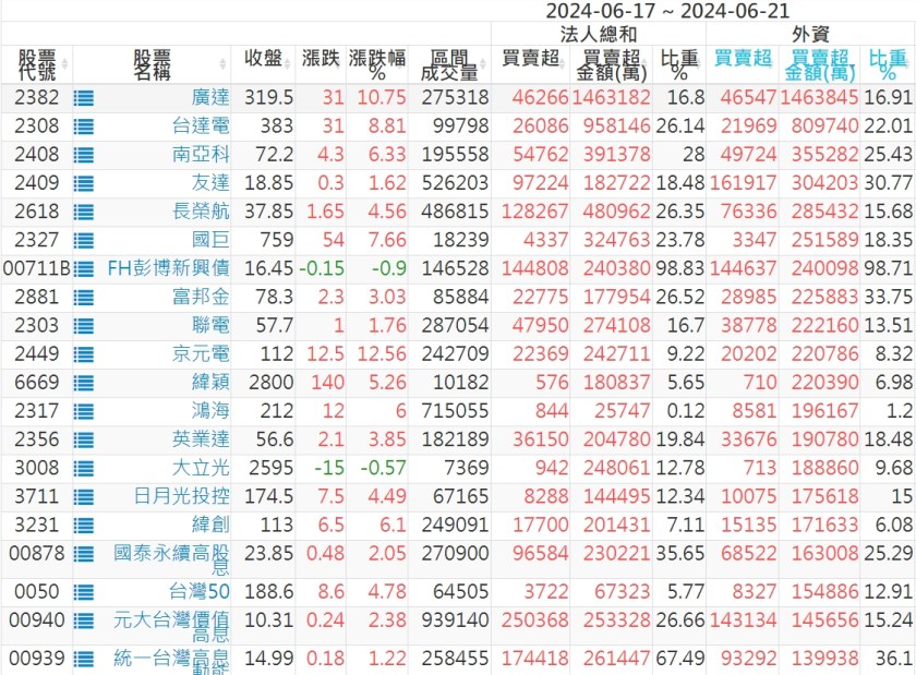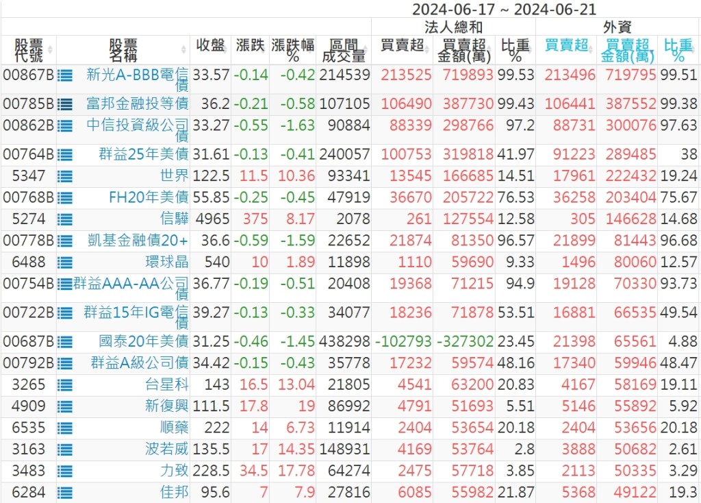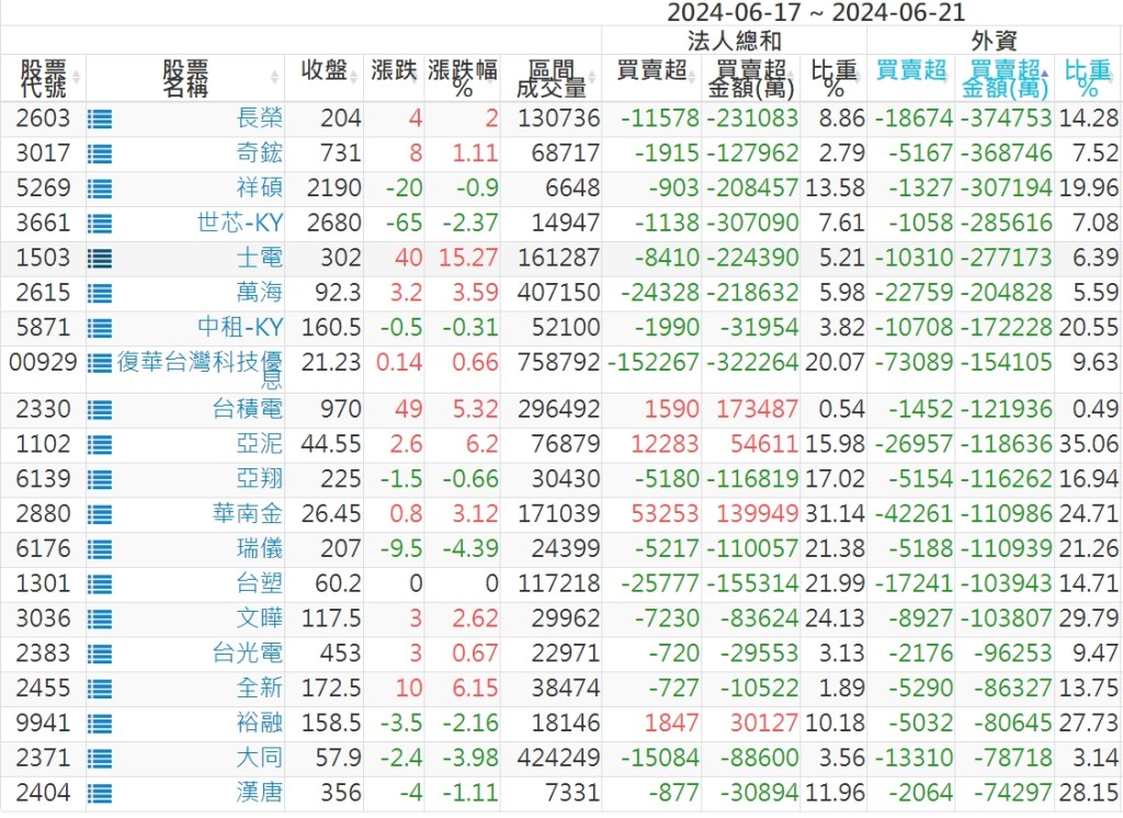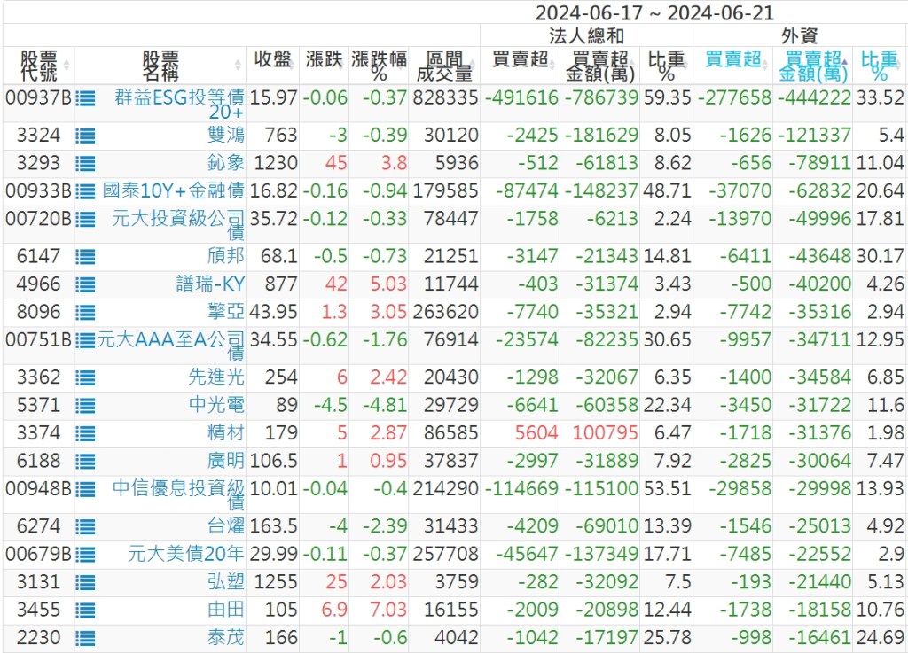 2024/06/17~2024/06/21近5日【外資】買賣超個股 2024-06-23 股狗網小編 投資誌-大盤 發表留言 外資本周累積【買超】約593億元。 【上市外資買超個股】(以金額排行,單位:萬) 【上市外資賣超個股】(以金額排行,單位:萬) 【上櫃外資買超個股】(以金額排行,單位:萬) 【上櫃外資賣超個股】(以金額排行,單位:萬) 免責宣言 本網站文章所提供資訊僅供參考,並無任何推介買賣之意,投資人應自行承擔交易風險。 分享此文: 分享到 X(在新視窗中開啟) X 分享到 Facebook(在新視窗中開啟) Facebook 喜歡 正在載入...