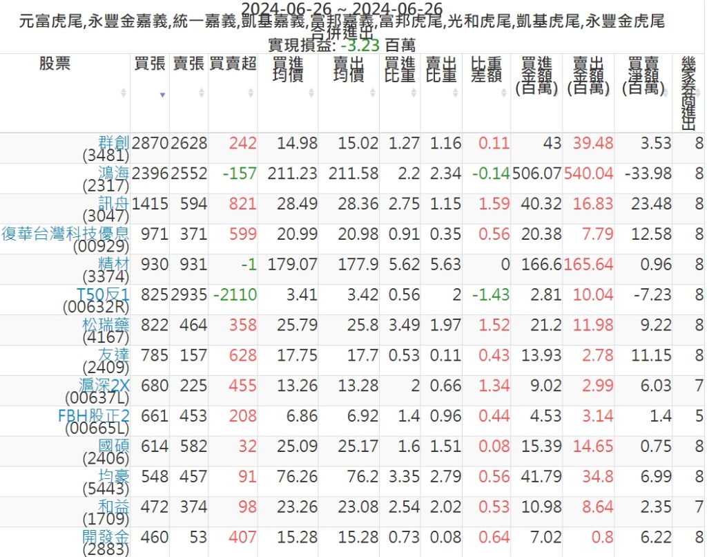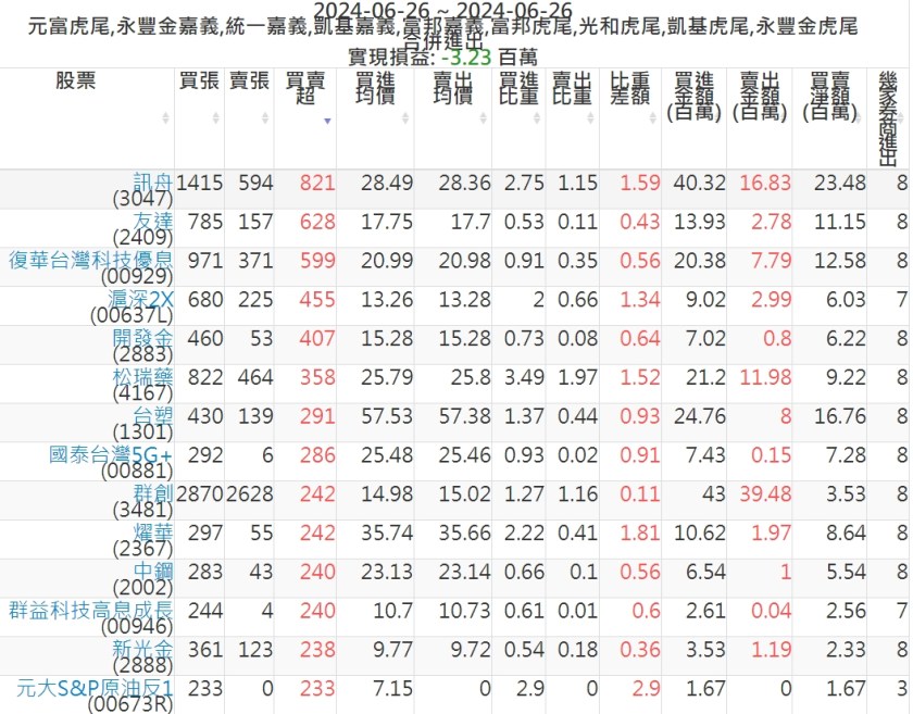 2024-0626主力買賣超個股 2024-06-26 股狗網小編 籌碼面每日資訊 發表留言 可參考下文 『如何查詢當沖、隔日沖分公司券商買賣』 主力當沖券商: 『元富虎尾』,『永豐金嘉義』,『統一嘉義』,『凱基嘉義』,『富邦嘉義』,『富邦虎尾』,『光和虎尾』,『凱基虎尾』,『永豐金虎尾』。 『當沖標的』 『買超股票』 『賣超股票』 免責宣言 本網站文章所提供資訊僅供參考,並無任何推介買賣之意,投資人應自行承擔交易風險。 分享此文: 按一下即可分享至 X(在新視窗中開啟) X 按一下以分享至 Facebook(在新視窗中開啟) Facebook 喜歡 正在載入...