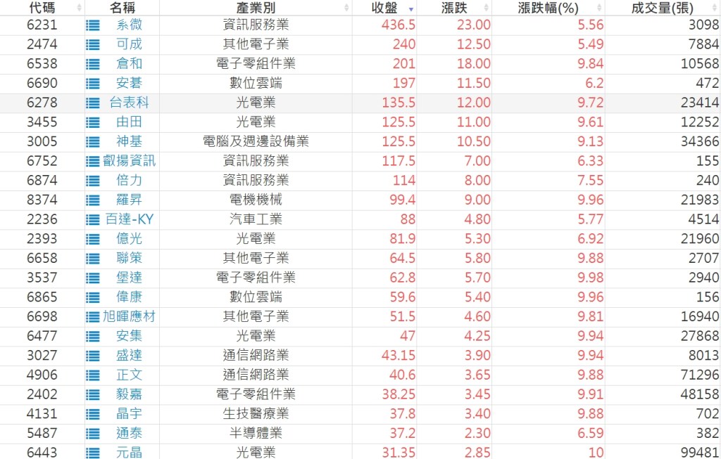 2024-0702日新高爆量上漲股 2024-07-02 aindex168 選股條件 發表留言 利用股狗選股的選股條件可以【挑選突破20日新高,爆量上漲起漲點股票】 1.股狗選股 https://www.stockdog.com.tw 2.選股條件: a.收盤價創20日新高 b.當日漲幅 > 2% C.成交量大於5日均量2倍 免責宣言 本網站文章所提供資訊僅供參考,並無任何推介買賣之意,投資人應自行承擔交易風險。 分享此文: 分享到 X(在新視窗中開啟) X 分享到 Facebook(在新視窗中開啟) Facebook 喜歡 正在載入...
