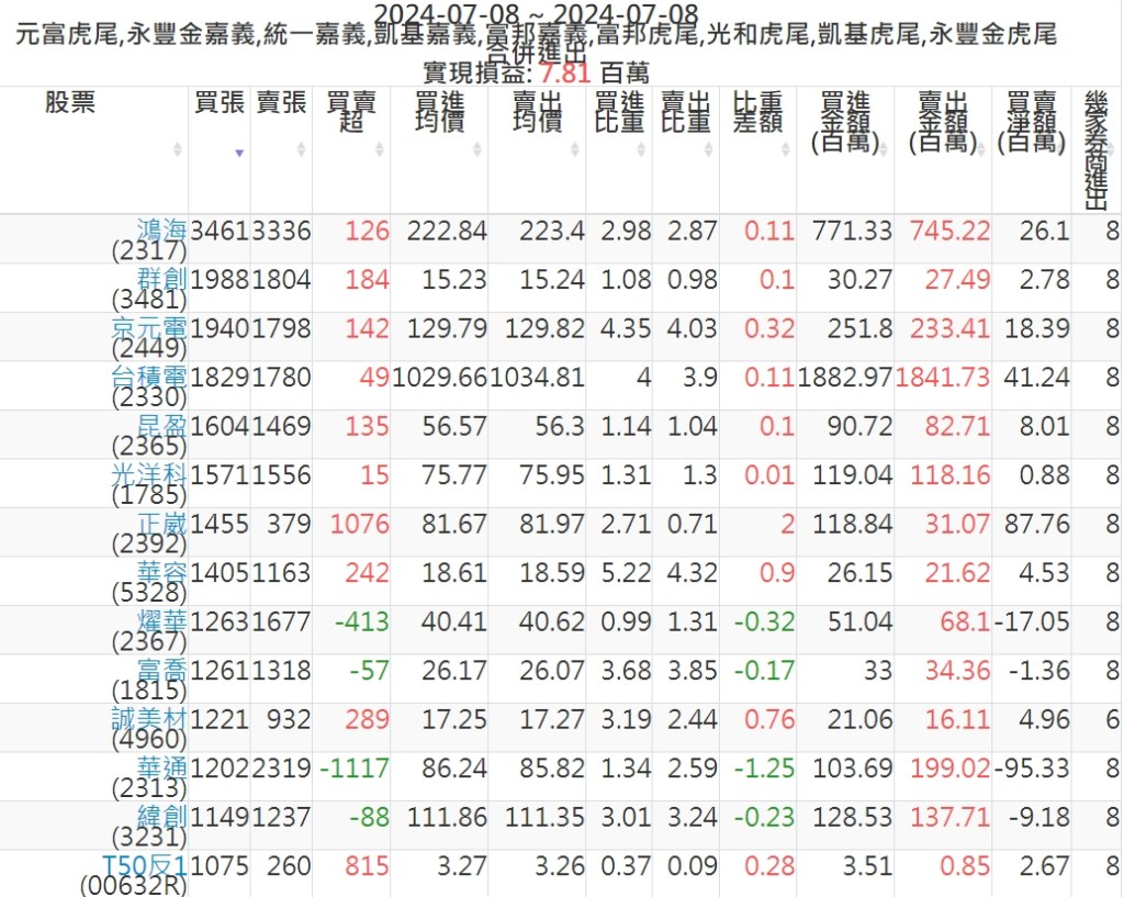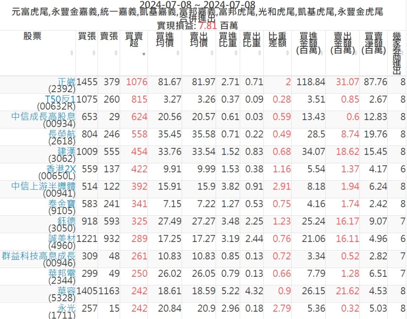 2024-0708主力買賣超個股 2024-07-08 股狗網小編 籌碼面每日資訊 發表留言 可參考下文 『如何查詢當沖、隔日沖分公司券商買賣』 主力當沖券商: 『元富虎尾』,『永豐金嘉義』,『統一嘉義』,『凱基嘉義』,『富邦嘉義』,『富邦虎尾』,『光和虎尾』,『凱基虎尾』,『永豐金虎尾』。 『當沖標的』 『買超股票』 『賣超股票』 免責宣言 本網站文章所提供資訊僅供參考,並無任何推介買賣之意,投資人應自行承擔交易風險。 分享此文: 分享到 X(在新視窗中開啟) X 分享到 Facebook(在新視窗中開啟) Facebook 喜歡 正在載入...