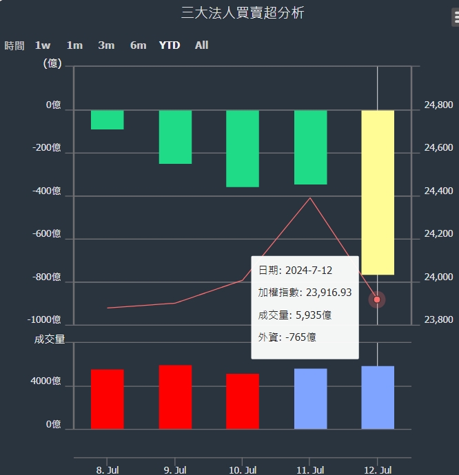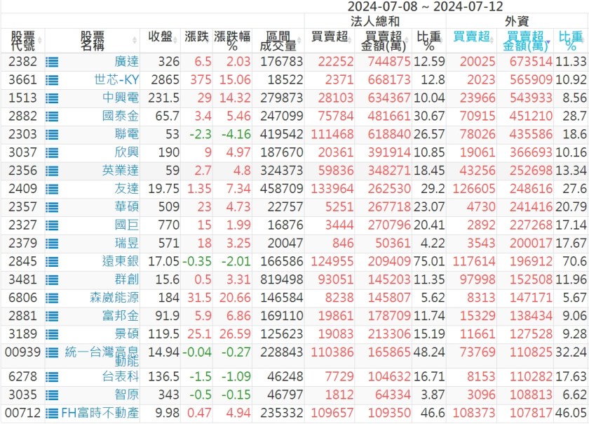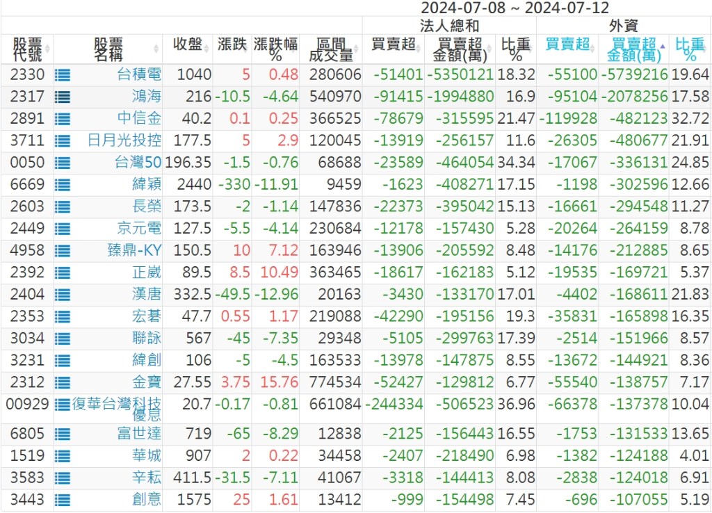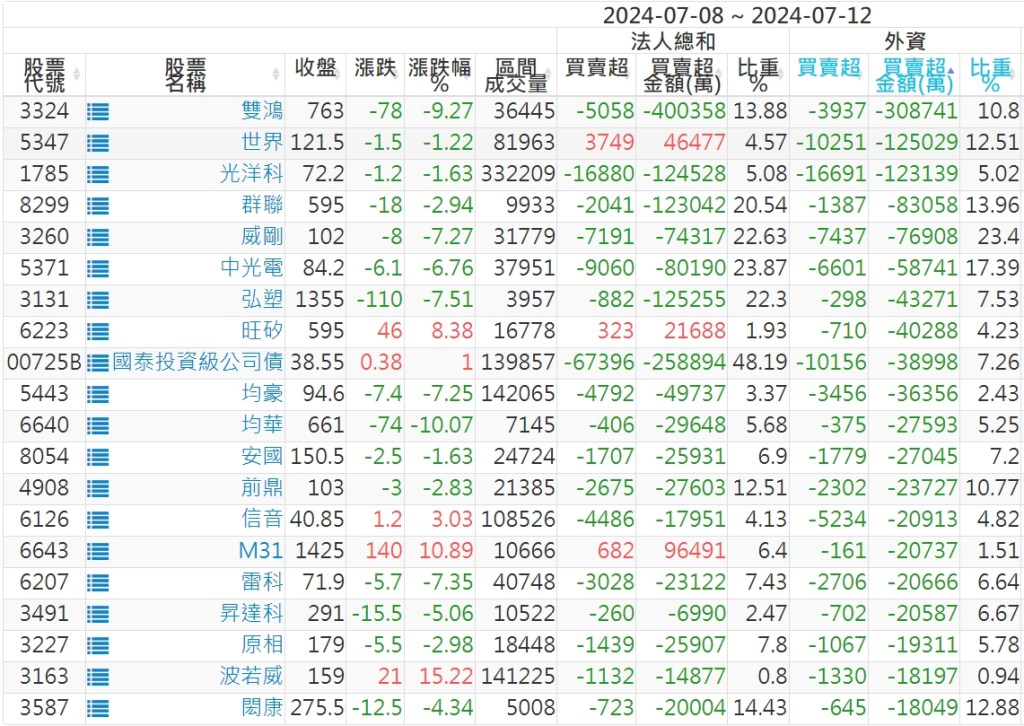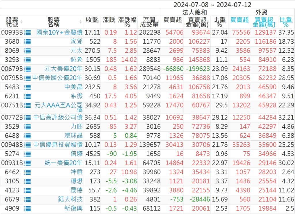 2024/07/08~2024/07/12近5日【外資】買賣超個股 2024-07-14 股狗網小編 投資誌-大盤 發表留言 外資本周累積【賣超】約765億元。 【上市外資買超個股】(以金額排行,單位:萬) 【上市外資賣超個股】(以金額排行,單位:萬) 【上櫃外資買超個股】(以金額排行,單位:萬) 【上櫃外資賣超個股】(以金額排行,單位:萬) 免責宣言 本網站文章所提供資訊僅供參考,並無任何推介買賣之意,投資人應自行承擔交易風險。 分享此文: 分享到 X(在新視窗中開啟) X 分享到 Facebook(在新視窗中開啟) Facebook 喜歡 正在載入...