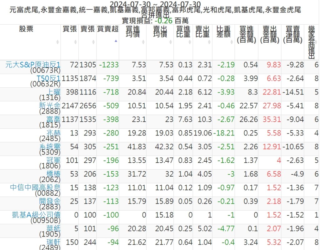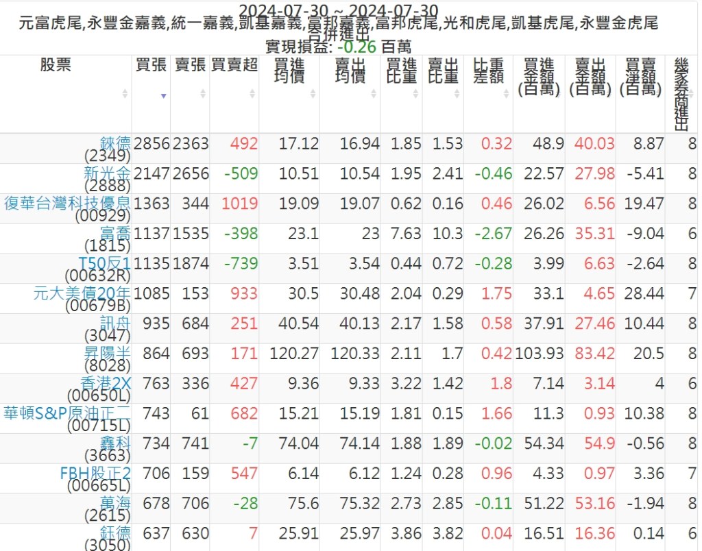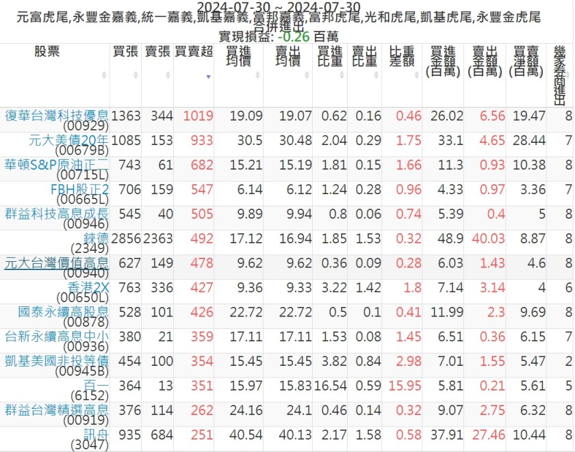 2024-0730主力買賣超個股 2024-07-30 股狗網小編 籌碼面每日資訊 發表留言 可參考下文 『如何查詢當沖、隔日沖分公司券商買賣』 主力當沖券商: 『元富虎尾』,『永豐金嘉義』,『統一嘉義』,『凱基嘉義』,『富邦嘉義』,『富邦虎尾』,『光和虎尾』,『凱基虎尾』,『永豐金虎尾』。 『當沖標的』 『買超股票』 『賣超股票』 免責宣言 本網站文章所提供資訊僅供參考,並無任何推介買賣之意,投資人應自行承擔交易風險。 分享此文: 分享到 X(在新視窗中開啟) X 分享到 Facebook(在新視窗中開啟) Facebook 喜歡 正在載入...