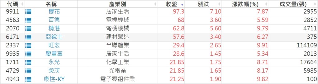 2024-0731日新高爆量上漲股 2024-07-31 股狗網小編 選股條件 發表留言 利用股狗選股的選股條件可以【挑選突破20日新高,爆量上漲起漲點股票】 1.股狗選股 https://www.stockdog.com.tw 2.選股條件: a.收盤價創20日新高 b.當日漲幅 > 2% C.成交量大於5日均量2倍 免責宣言 本網站文章所提供資訊僅供參考,並無任何推介買賣之意,投資人應自行承擔交易風險。 分享此文: 分享到 X(在新視窗中開啟) X 分享到 Facebook(在新視窗中開啟) Facebook 喜歡 正在載入...
