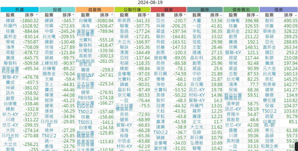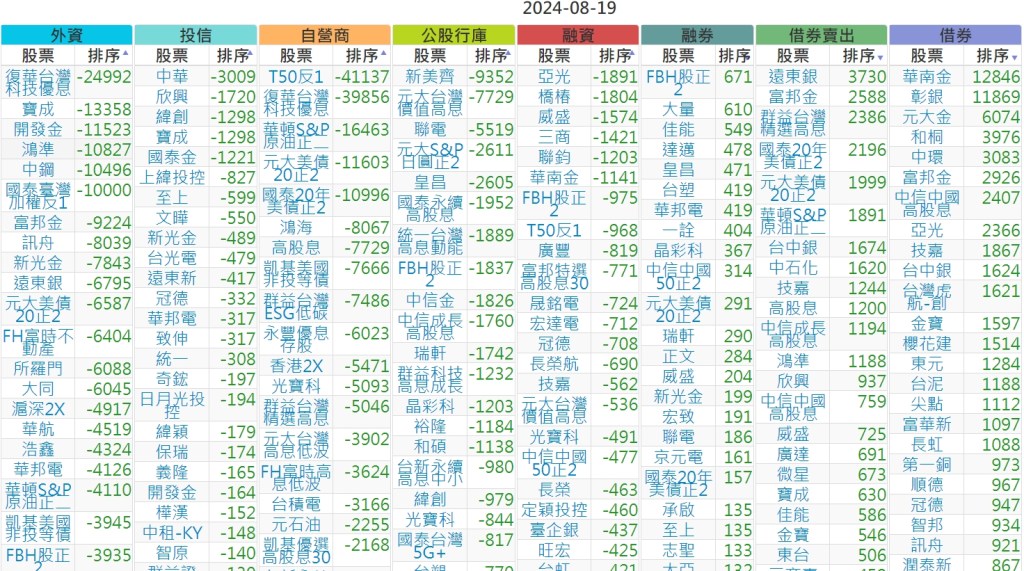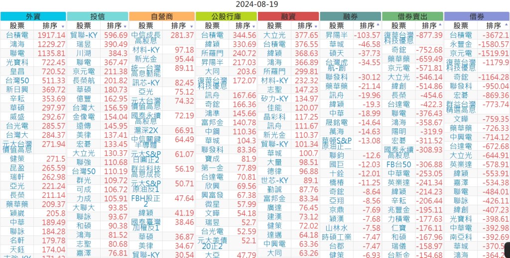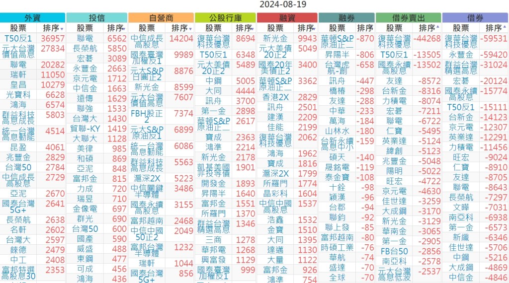 2024-0819【外資、投信】買賣超個股 2024-08-20 股狗網小編 投資誌-大盤 發表留言 上市:【外資、投信】買超(依金額) (單位:百萬) 上市:【外資、投信】賣超(依金額) (單位:百萬) 上市:【外資、投信】買超(依張數) (單位:張數) 上市:【外資、投信】賣超(依張數) (單位:張數) 免責宣言 本網站文章所提供資訊僅供參考,並無任何推介買賣之意,投資人應自行承擔交易風險。 分享此文: 分享到 X(在新視窗中開啟) X 分享到 Facebook(在新視窗中開啟) Facebook 喜歡 正在載入...