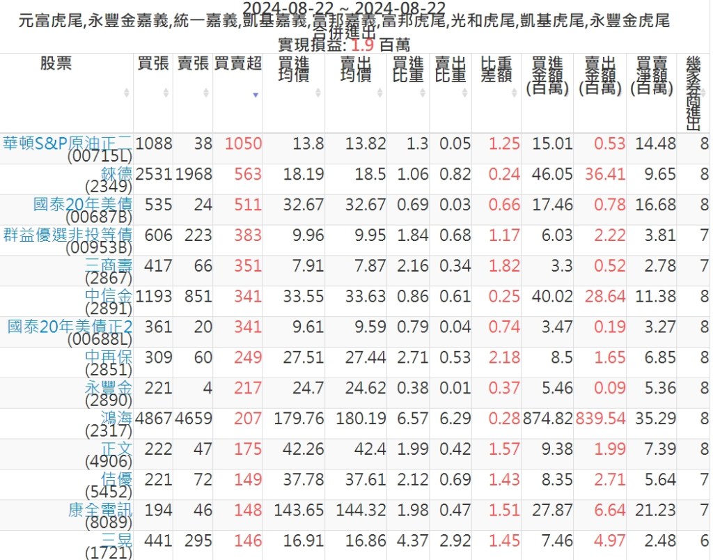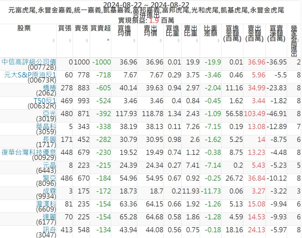 2024-0822主力買賣超個股 2024-08-22 股狗網小編 籌碼面每日資訊 發表留言 可參考下文 『如何查詢當沖、隔日沖分公司券商買賣』 主力當沖券商: 『元富虎尾』,『永豐金嘉義』,『統一嘉義』,『凱基嘉義』,『富邦嘉義』,『富邦虎尾』,『光和虎尾』,『凱基虎尾』,『永豐金虎尾』。 『當沖標的』 『買超股票』 『賣超股票』 免責宣言 本網站文章所提供資訊僅供參考,並無任何推介買賣之意,投資人應自行承擔交易風險。 分享此文: 分享到 X(在新視窗中開啟) X 分享到 Facebook(在新視窗中開啟) Facebook 喜歡 正在載入...