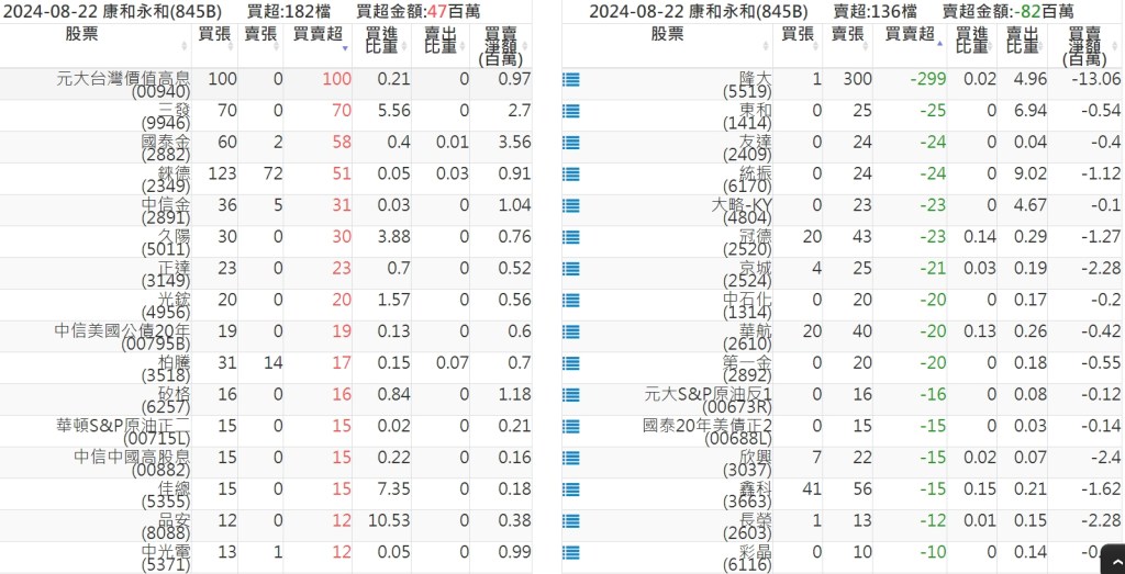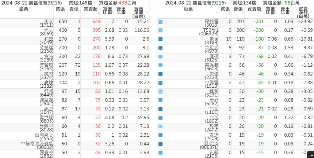2024-0822關鍵券商買賣超 2024-08-22 aindex168 籌碼面每日資訊 發表留言 關鍵券商買賣超: 臺銀證券(1040): 台灣摩根士丹利(1470): 凱基台北(9268): 凱基信義(9216): 元大土城永寧(9875): 康和永和(845B) : 富邦建國(9658): 免責宣言 本網站文章所提供資訊僅供參考,並無任何推介買賣之意,投資人應自行承擔交易風險。 分享此文: 按一下即可分享至 X(在新視窗中開啟) X 按一下以分享至 Facebook(在新視窗中開啟) Facebook 喜歡 正在載入...