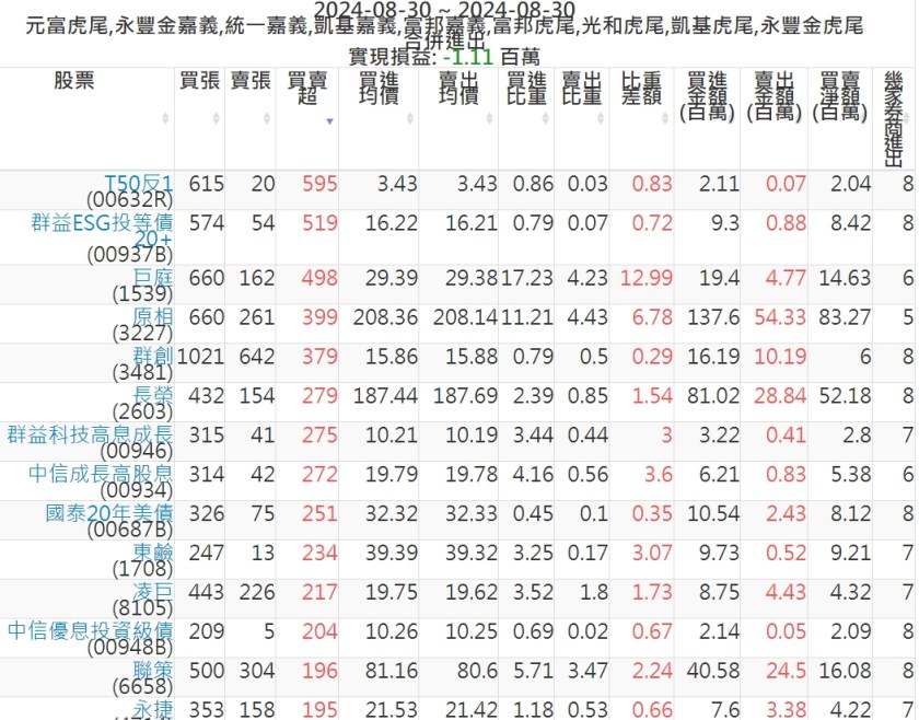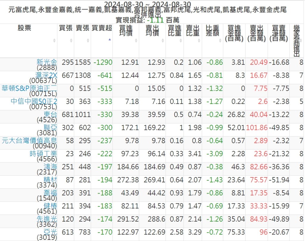 2024-0830主力買賣超個股 2024-08-31 股狗網小編 籌碼面每日資訊 發表留言 可參考下文 『如何查詢當沖、隔日沖分公司券商買賣』 主力當沖券商: 『元富虎尾』,『永豐金嘉義』,『統一嘉義』,『凱基嘉義』,『富邦嘉義』,『富邦虎尾』,『光和虎尾』,『凱基虎尾』,『永豐金虎尾』。 『當沖標的』 『買超股票』 『賣超股票』 免責宣言 本網站文章所提供資訊僅供參考,並無任何推介買賣之意,投資人應自行承擔交易風險。 分享此文: 按一下即可分享至 X(在新視窗中開啟) X 按一下以分享至 Facebook(在新視窗中開啟) Facebook 喜歡 正在載入...