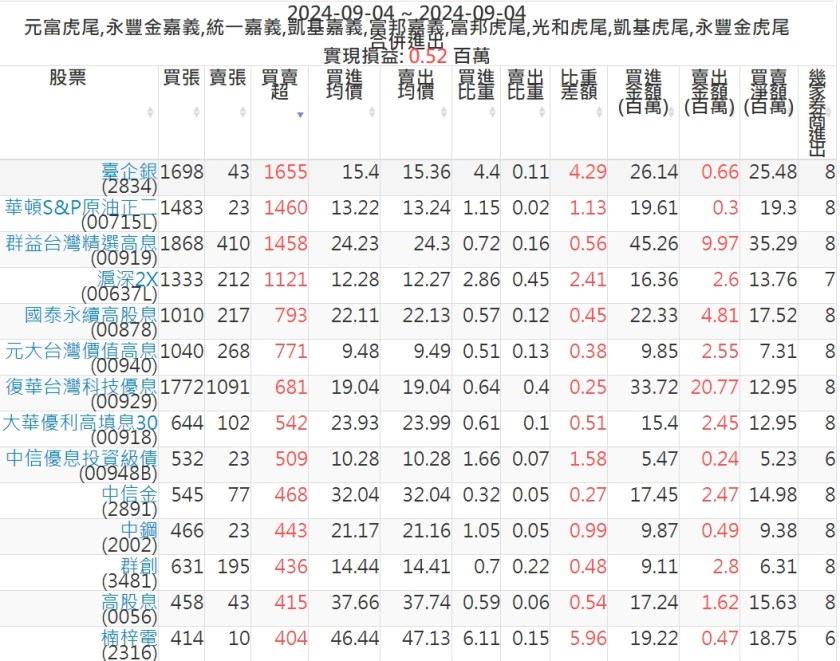 2024-0904主力買賣超個股 2024-09-04 股狗網小編 籌碼面每日資訊 發表留言 可參考下文 『如何查詢當沖、隔日沖分公司券商買賣』 主力當沖券商: 『元富虎尾』,『永豐金嘉義』,『統一嘉義』,『凱基嘉義』,『富邦嘉義』,『富邦虎尾』,『光和虎尾』,『凱基虎尾』,『永豐金虎尾』。 『當沖標的』 『買超股票』 『賣超股票』 免責宣言 本網站文章所提供資訊僅供參考,並無任何推介買賣之意,投資人應自行承擔交易風險。 分享此文: 分享到 X(在新視窗中開啟) X 分享到 Facebook(在新視窗中開啟) Facebook 喜歡 正在載入...