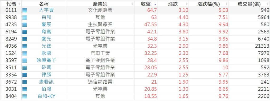 2024-0906日新高爆量上漲股 2024-09-06 股狗網小編 選股條件 發表留言 利用股狗選股的選股條件可以【挑選突破20日新高,爆量上漲起漲點股票】 1.股狗選股 https://www.stockdog.com.tw 2.選股條件: a.收盤價創20日新高 b.當日漲幅 > 2% C.成交量大於5日均量2倍 免責宣言 本網站文章所提供資訊僅供參考,並無任何推介買賣之意,投資人應自行承擔交易風險。 分享此文: 按一下即可分享至 X(在新視窗中開啟) X 按一下以分享至 Facebook(在新視窗中開啟) Facebook 喜歡 正在載入...