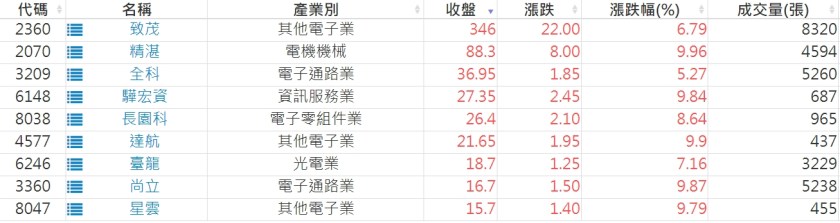 2024-0910日新高爆量上漲股 2024-09-10 股狗網小編 選股條件 發表留言 利用股狗選股的選股條件可以【挑選突破20日新高,爆量上漲起漲點股票】 1.股狗選股 https://www.stockdog.com.tw 2.選股條件: a.收盤價創20日新高 b.當日漲幅 > 2% C.成交量大於5日均量2倍 免責宣言 本網站文章所提供資訊僅供參考,並無任何推介買賣之意,投資人應自行承擔交易風險。 分享此文: 分享到 X(在新視窗中開啟) X 分享到 Facebook(在新視窗中開啟) Facebook 喜歡 正在載入...