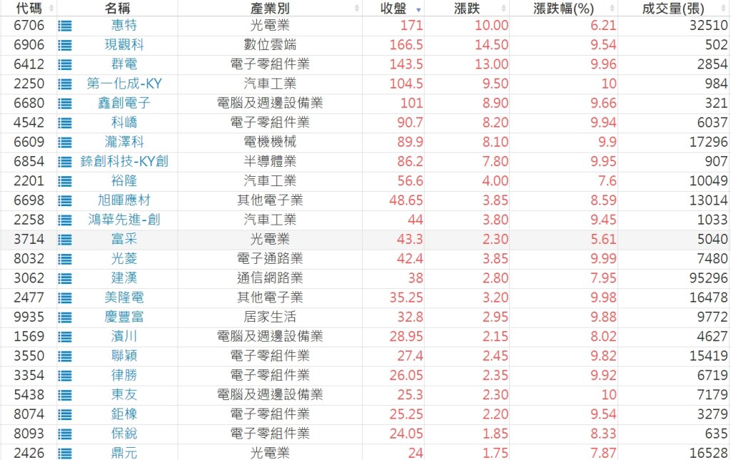 2024-0916日新高爆量上漲股 2024-09-16 股狗網小編 選股條件 發表留言 利用股狗選股的選股條件可以【挑選突破20日新高,爆量上漲起漲點股票】 1.股狗選股 https://www.stockdog.com.tw 2.選股條件: a.收盤價創20日新高 b.當日漲幅 > 2% C.成交量大於5日均量2倍 免責宣言 本網站文章所提供資訊僅供參考,並無任何推介買賣之意,投資人應自行承擔交易風險。 分享此文: 按一下即可分享至 X(在新視窗中開啟) X 按一下以分享至 Facebook(在新視窗中開啟) Facebook 喜歡 正在載入...