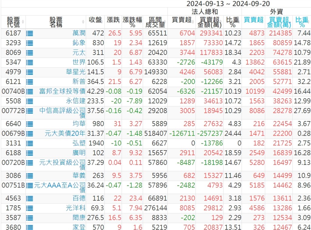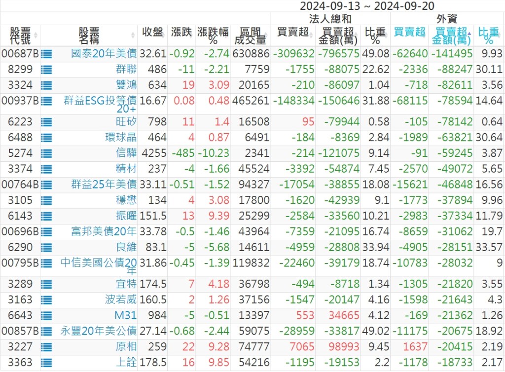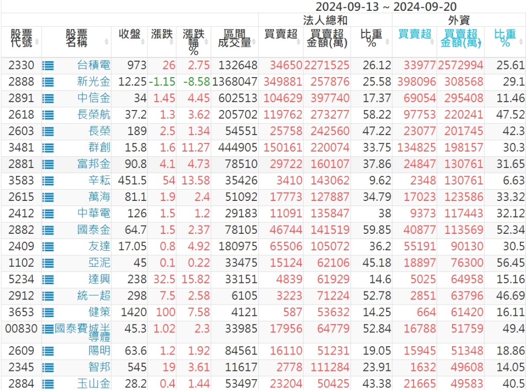 2024/09/13~2024/09/20近5日【外資】買賣超個股 2024-09-22 股狗網小編 投資誌-大盤 發表留言 外資本周累積【買超】約359億元。 【上市外資買超個股】(以金額排行,單位:萬) 【上市外資賣超個股】(以金額排行,單位:萬) 【上櫃外資買超個股】(以金額排行,單位:萬) 【上櫃外資賣超個股】(以金額排行,單位:萬) 免責宣言 本網站文章所提供資訊僅供參考,並無任何推介買賣之意,投資人應自行承擔交易風險。 分享此文: 分享到 X(在新視窗中開啟) X 分享到 Facebook(在新視窗中開啟) Facebook 喜歡 正在載入...