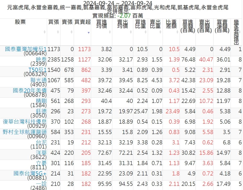 2024-0924主力買賣超個股 2024-09-24 股狗網小編 籌碼面每日資訊 發表留言 可參考下文 『如何查詢當沖、隔日沖分公司券商買賣』 主力當沖券商: 『元富虎尾』,『永豐金嘉義』,『統一嘉義』,『凱基嘉義』,『富邦嘉義』,『富邦虎尾』,『光和虎尾』,『凱基虎尾』,『永豐金虎尾』。 『當沖標的』 『買超股票』 『賣超股票』 免責宣言 本網站文章所提供資訊僅供參考,並無任何推介買賣之意,投資人應自行承擔交易風險。 分享此文: 分享到 X(在新視窗中開啟) X 分享到 Facebook(在新視窗中開啟) Facebook 喜歡 正在載入...