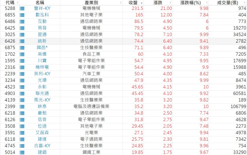 2024-1004日新高爆量上漲股 2024-10-04 股狗網小編 選股條件 發表留言 利用股狗選股的選股條件可以【挑選突破20日新高,爆量上漲起漲點股票】 1.股狗選股 https://www.stockdog.com.tw 2.選股條件: a.收盤價創20日新高 b.當日漲幅 > 2% C.成交量大於5日均量2倍 免責宣言 本網站文章所提供資訊僅供參考,並無任何推介買賣之意,投資人應自行承擔交易風險。 分享此文: 分享到 X(在新視窗中開啟) X 分享到 Facebook(在新視窗中開啟) Facebook 喜歡 正在載入...