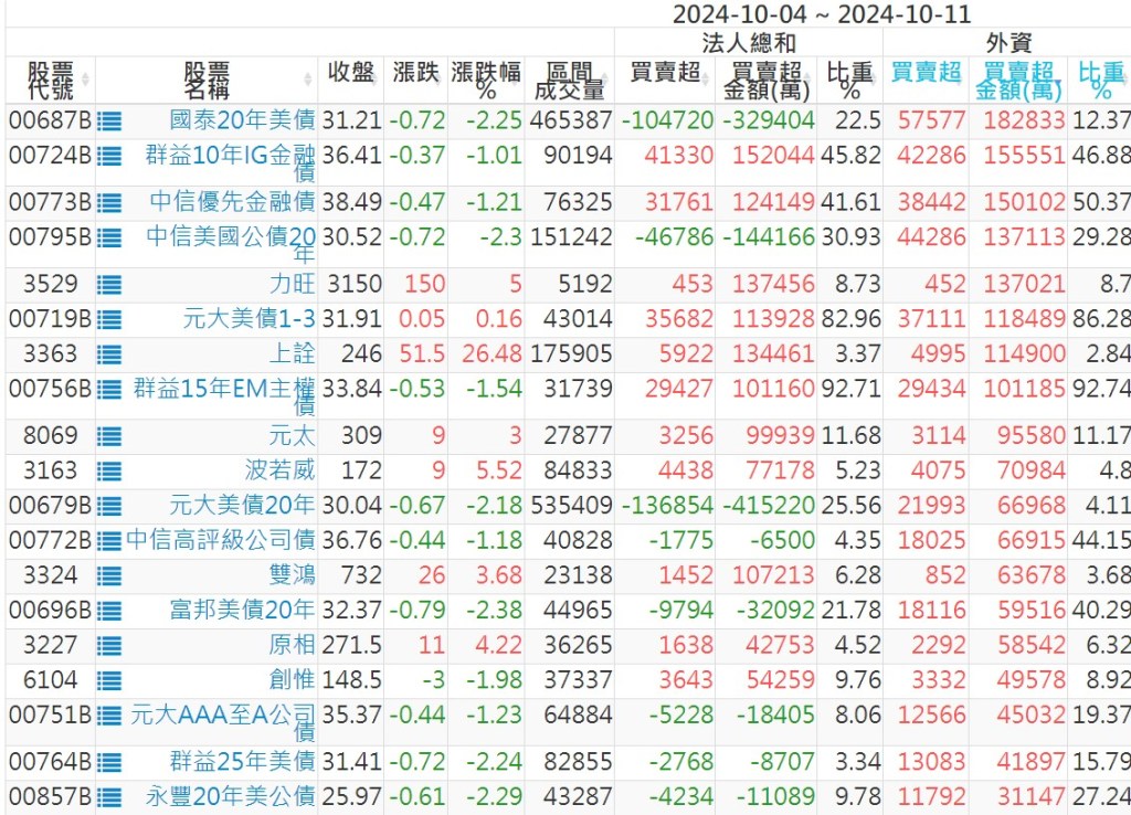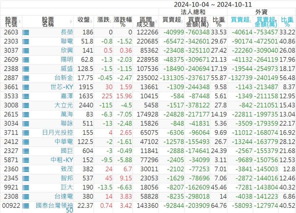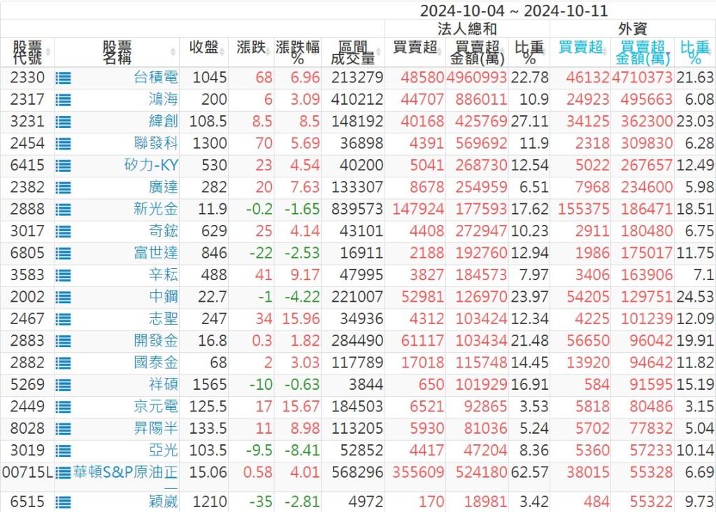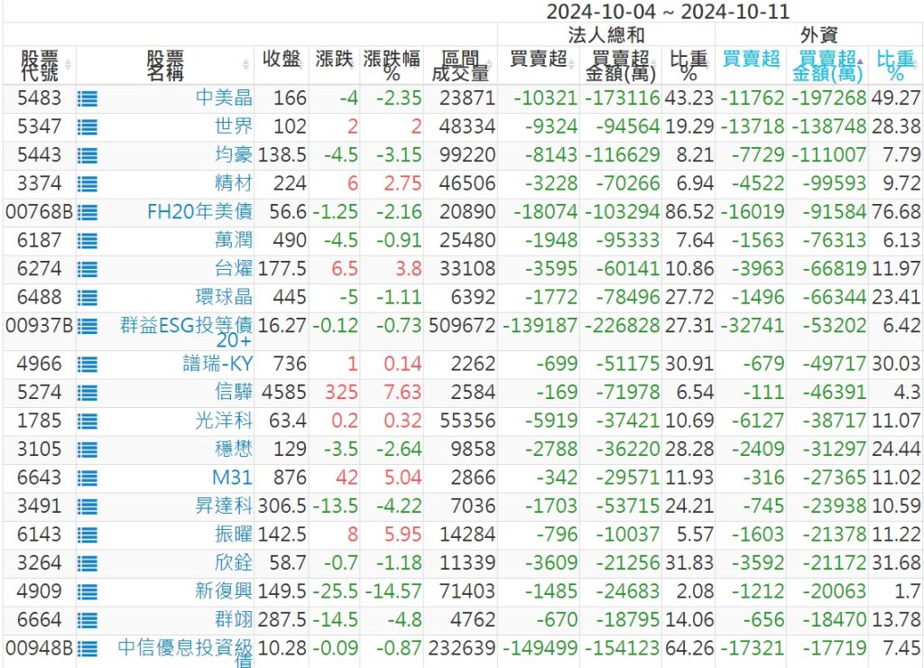 2024/10/04~2024/10/11近5日【外資】買賣超個股 2024-10-13 股狗網小編 投資誌-大盤 發表留言 外資本周累積【賣超】約103億元。 【上市外資買超個股】(以金額排行,單位:萬) 【上市外資賣超個股】(以金額排行,單位:萬) 【上櫃外資買超個股】(以金額排行,單位:萬) 【上櫃外資賣超個股】(以金額排行,單位:萬) 免責宣言 本網站文章所提供資訊僅供參考,並無任何推介買賣之意,投資人應自行承擔交易風險。 分享此文: 分享到 X(在新視窗中開啟) X 分享到 Facebook(在新視窗中開啟) Facebook 喜歡 正在載入...