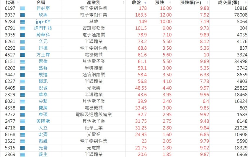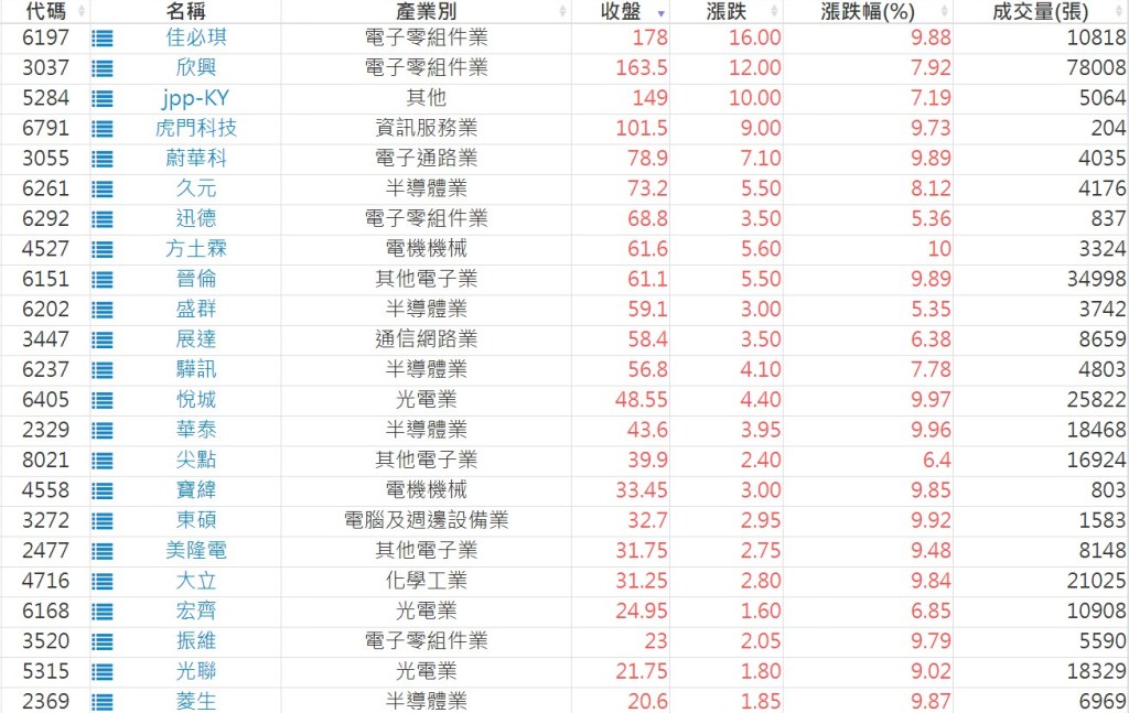 2024-1022日新高爆量上漲股 2024-10-22 股狗網小編 選股條件 發表留言 利用股狗選股的選股條件可以【挑選突破20日新高,爆量上漲起漲點股票】 1.股狗選股 https://www.stockdog.com.tw 2.選股條件: a.收盤價創20日新高 b.當日漲幅 > 2% C.成交量大於5日均量2倍 免責宣言 本網站文章所提供資訊僅供參考,並無任何推介買賣之意,投資人應自行承擔交易風險。 分享此文: 分享到 X(在新視窗中開啟) X 分享到 Facebook(在新視窗中開啟) Facebook 喜歡 正在載入...