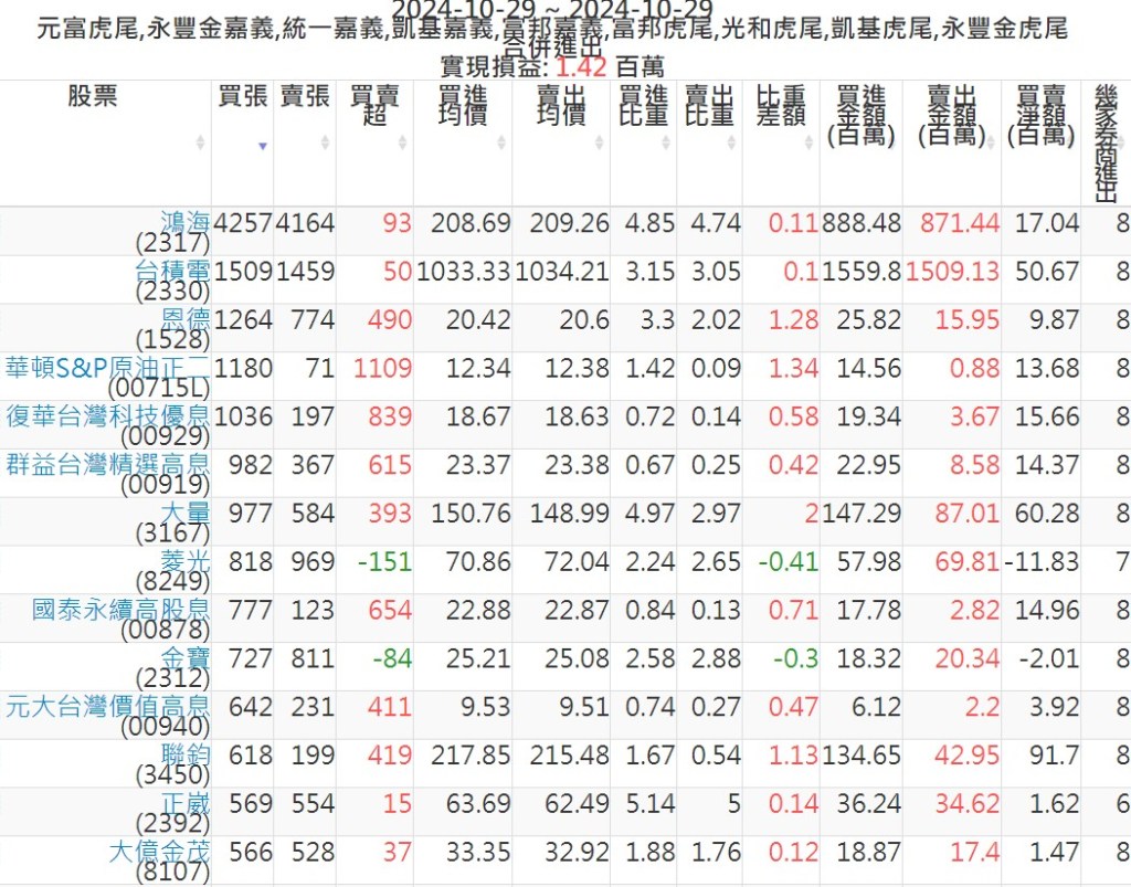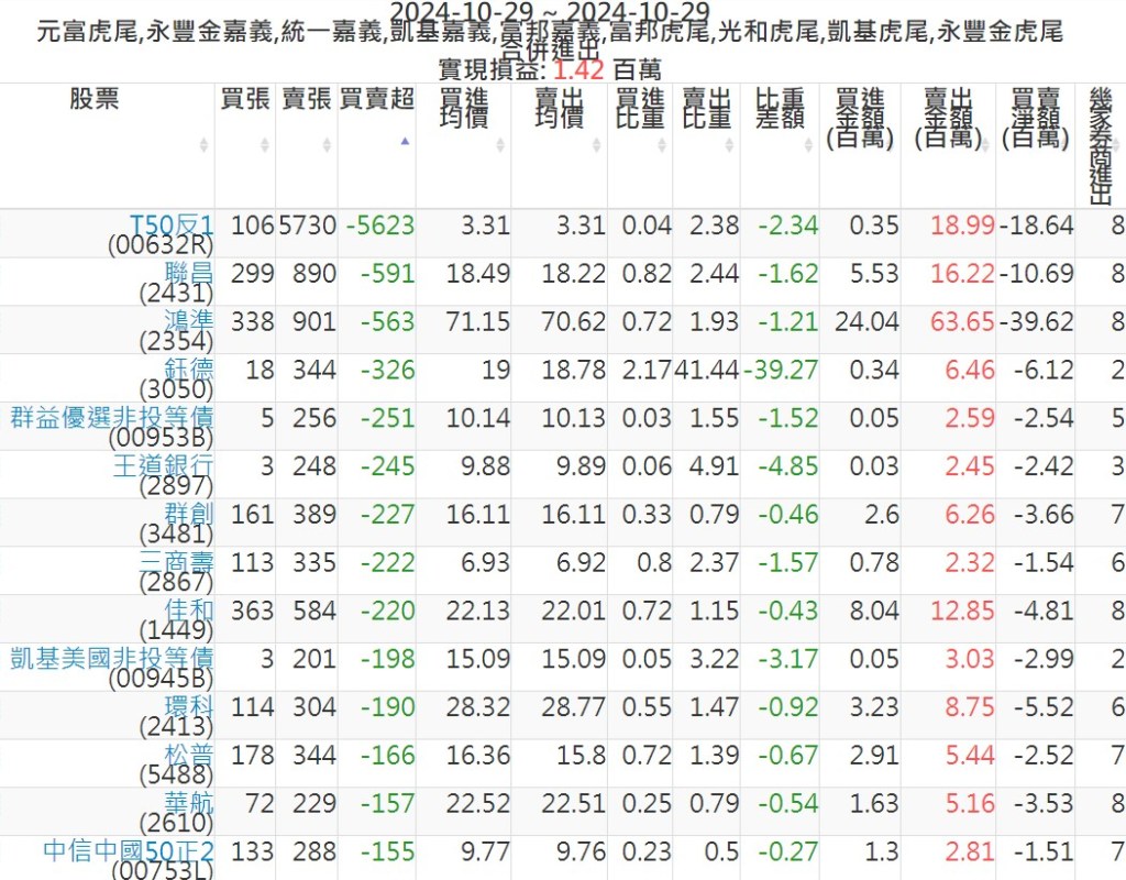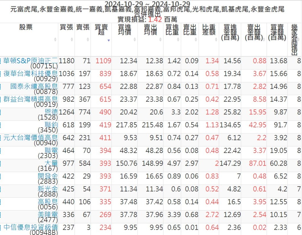 2024-1029主力買賣超個股 2024-10-29 股狗網小編 籌碼面每日資訊 發表留言 可參考下文 『如何查詢當沖、隔日沖分公司券商買賣』 主力當沖券商: 『元富虎尾』,『永豐金嘉義』,『統一嘉義』,『凱基嘉義』,『富邦嘉義』,『富邦虎尾』,『光和虎尾』,『凱基虎尾』,『永豐金虎尾』。 『當沖標的』 『買超股票』 『賣超股票』 免責宣言 本網站文章所提供資訊僅供參考,並無任何推介買賣之意,投資人應自行承擔交易風險。 分享此文: 按一下即可分享至 X(在新視窗中開啟) X 按一下以分享至 Facebook(在新視窗中開啟) Facebook 喜歡 正在載入...
