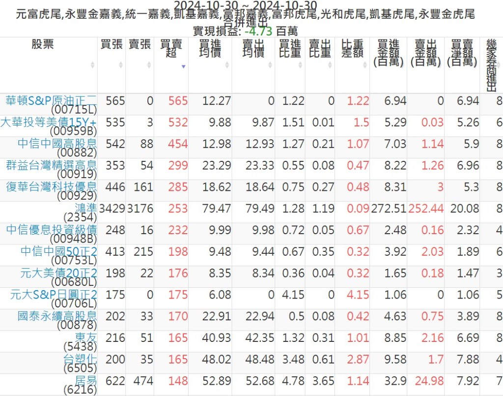 2024-1030主力買賣超個股 2024-10-30 股狗網小編 籌碼面每日資訊 發表留言 可參考下文 『如何查詢當沖、隔日沖分公司券商買賣』 主力當沖券商: 『元富虎尾』,『永豐金嘉義』,『統一嘉義』,『凱基嘉義』,『富邦嘉義』,『富邦虎尾』,『光和虎尾』,『凱基虎尾』,『永豐金虎尾』。 『當沖標的』 『買超股票』 『賣超股票』 免責宣言 本網站文章所提供資訊僅供參考,並無任何推介買賣之意,投資人應自行承擔交易風險。 分享此文: 按一下即可分享至 X(在新視窗中開啟) X 按一下以分享至 Facebook(在新視窗中開啟) Facebook 喜歡 正在載入...